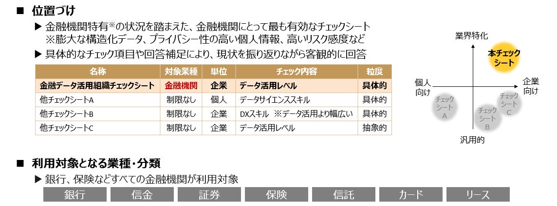 本チェックシートは、金融機関にとって最も有効なものとなるよう、利用対象を銀行や保険などのすべての金融機関に絞って制定されています。