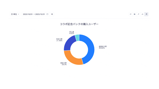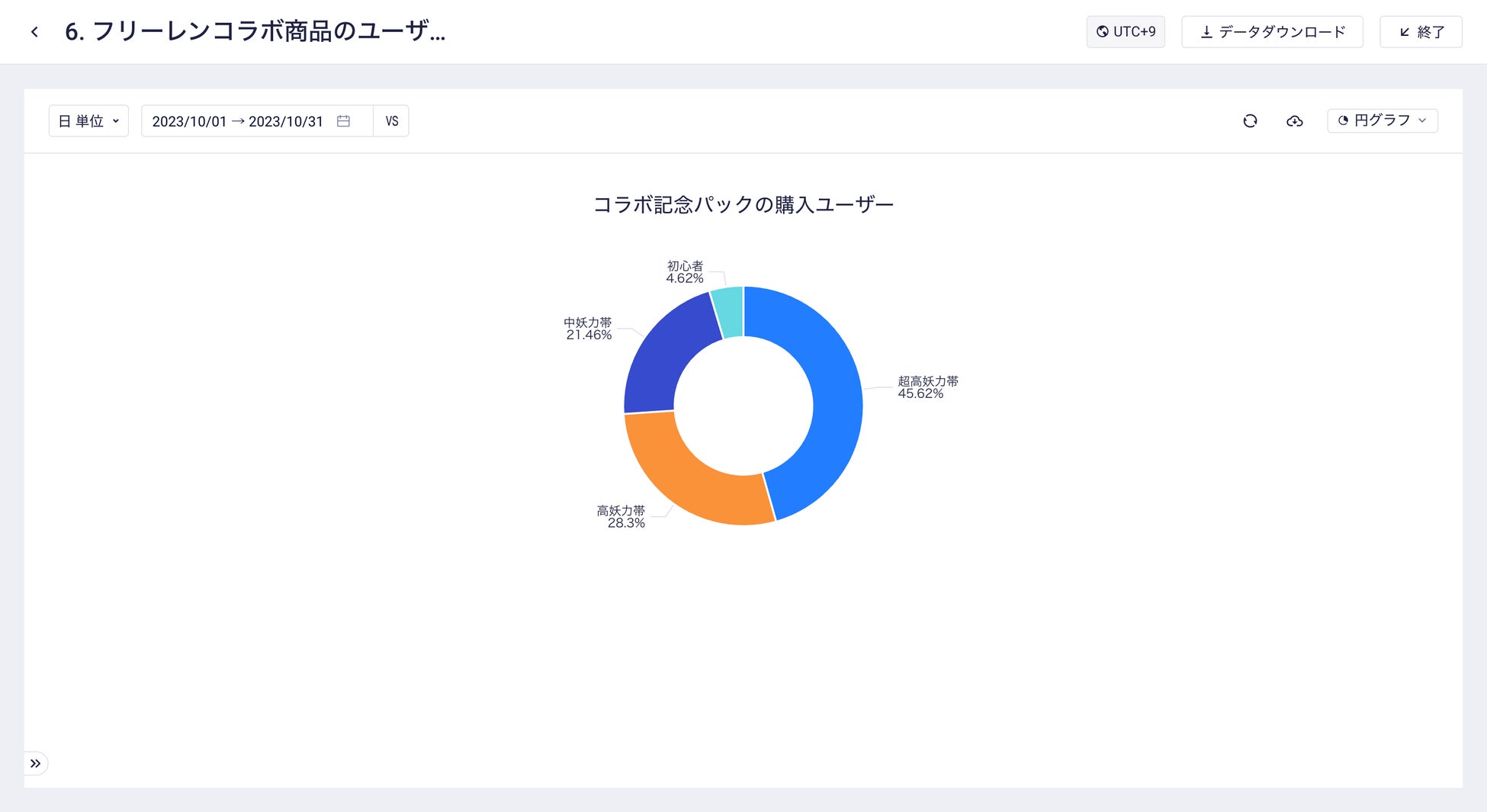 コラボキャンペーンに際しては、コラボ記念パックが複数個販売された。コラボキャンペーン期間中の購入ユーザー数の割合を、妖力(ゲーム内の強さと捉えて良い)別で区分すると、高い妖力帯ユーザーの購入も多く、高課金ユーザーの底上げにも寄与していることがわかった。逆に10月中の新規登録ユーザーはキャンペーン期間後半になるにつれて、コラボパックの購入数も増加しており、ログインボーナスの取得やピックアップガチャなどの施策との連動による効果が見られた。