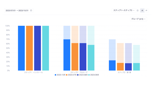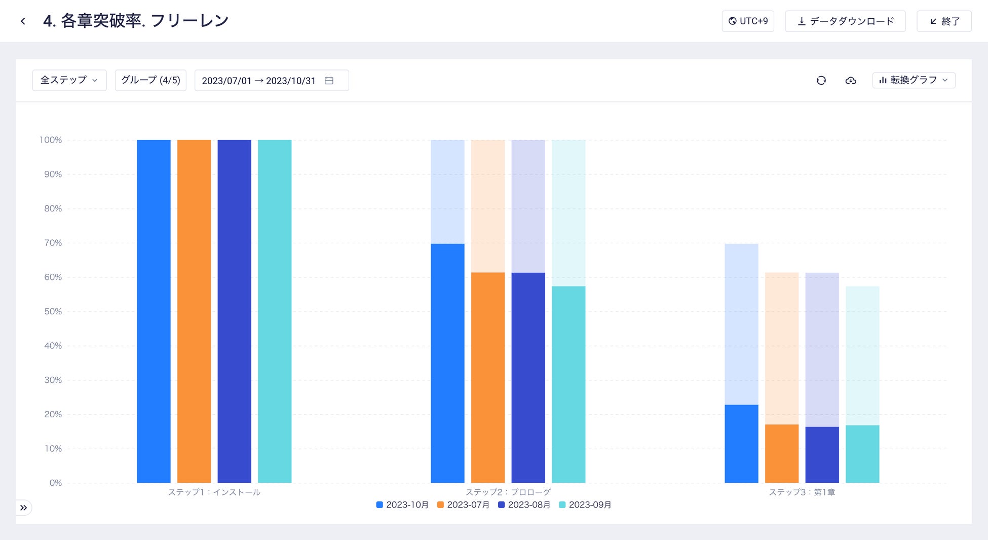 図表05「各章へのファネル. 左からインストール、プロローグ、第1章。2023年7月から10月に登録したユーザー。識別期間はインストールから7日以内。」