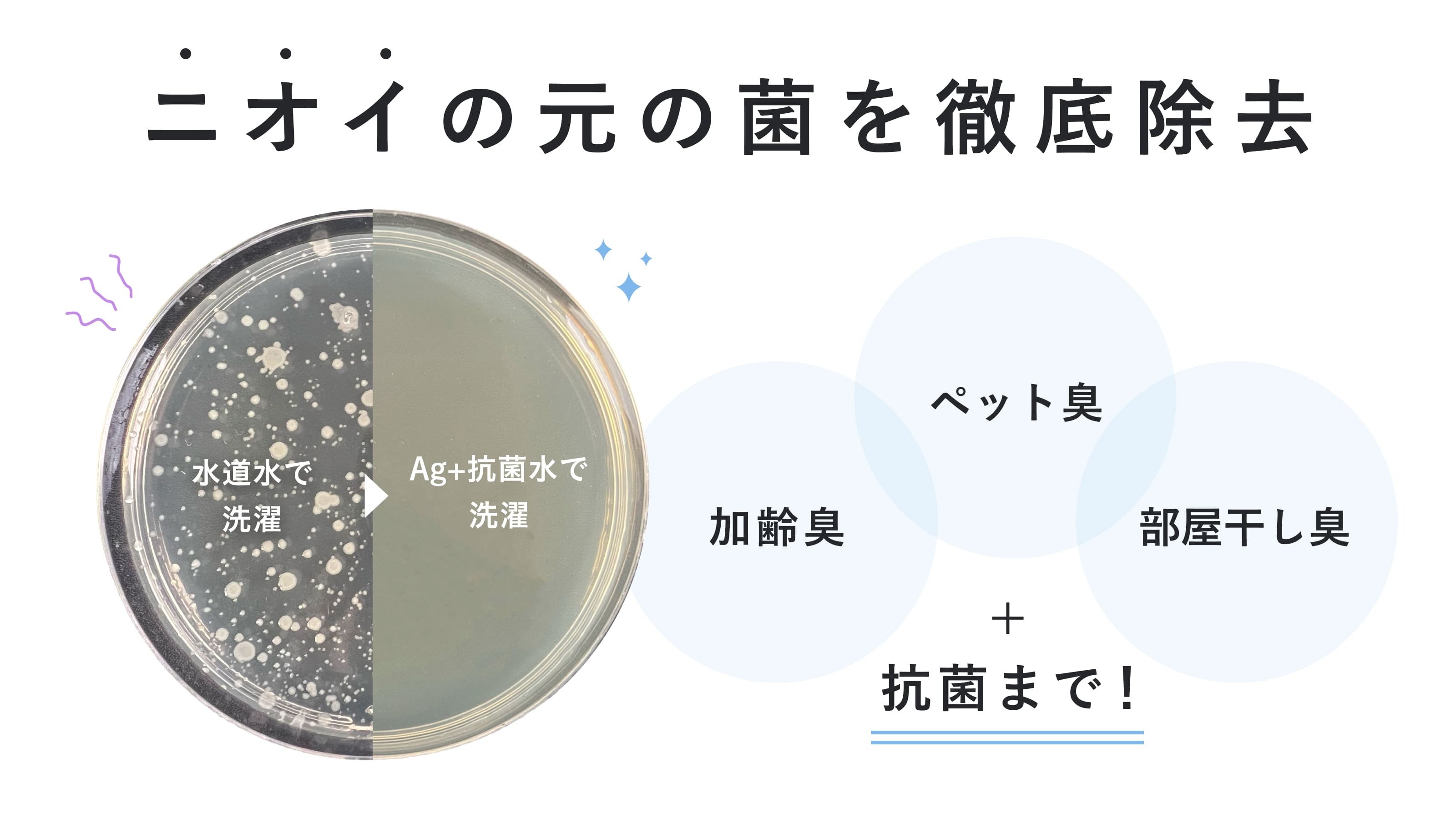 さらに、活性炭フィルターにはAg+抗菌成分を添加。オーガニックファインバブルとともに繊維の奥に入り込み、衣類にしっかり浸透。洗濯のたびに抗菌して、部屋干し臭などのもとになる雑菌が衣類に繁殖するのを防ぎます。