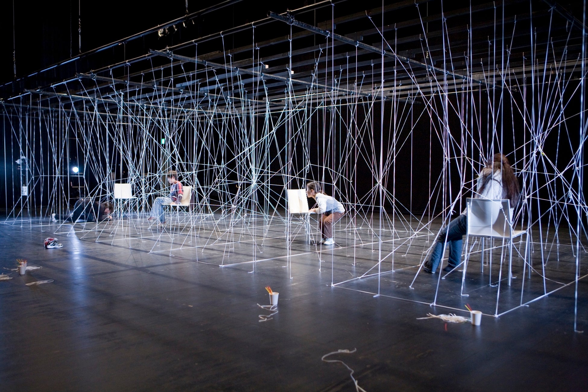 ゴムひもが張り巡らされた障害物のある空間で動き回り、自分の身体の特性と「空間と動き」の関係を学ぶワークショップです。