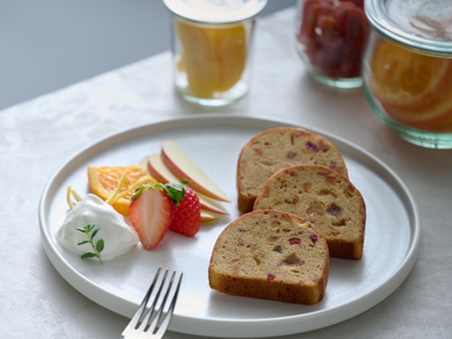 今回のパウンドケーキでは、岡昇のドライフルーツのみずみずしさを感じる食感と風味が、味のアクセントになっています。