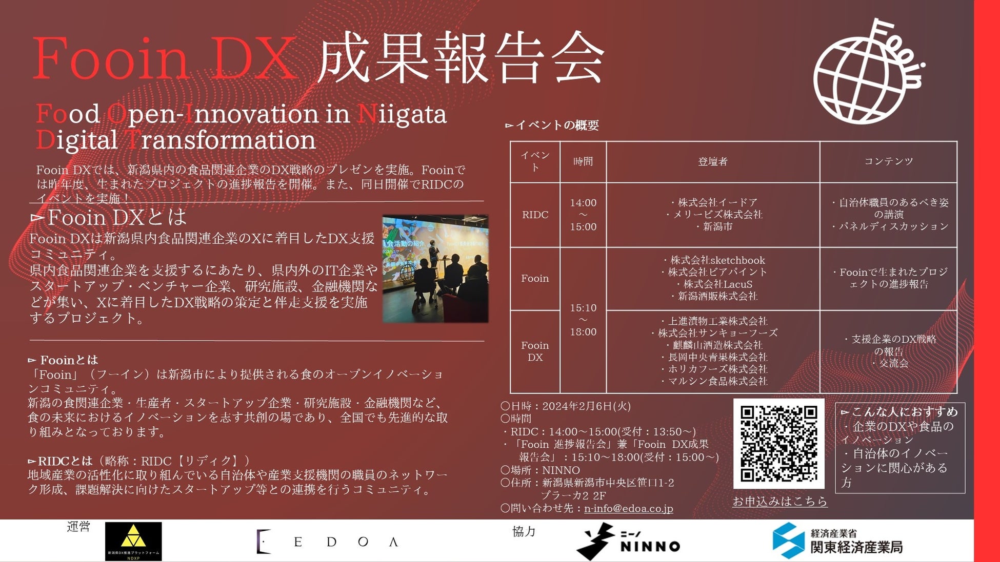 令和4年度補正「地域新成長産業創出促進事業費補助金(地域DX促進環境整備事業(業種等特化型DX促進事業))地域DX支援活動型」の取組みであるFooinDX事業プログラムにおいて、NDXP(新潟県DX推進プラットフォーム)などが主体となり、新潟県内食品関連企業に特化したDX推進を行って参りました。取り組みの成果について各参加企業よりご報告致します。
