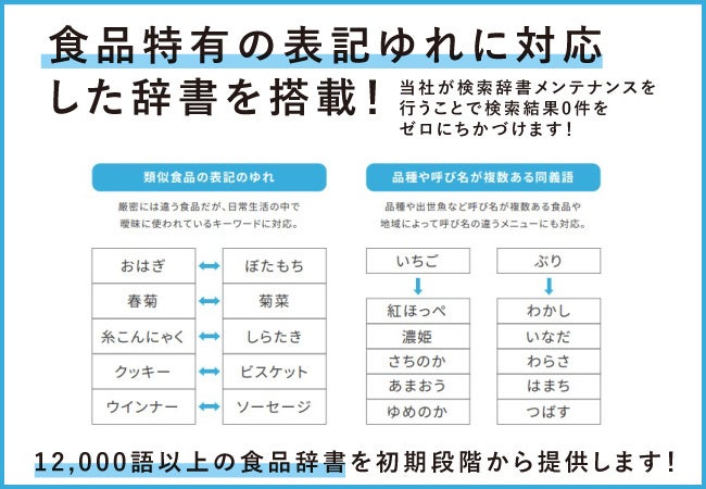「Retca SEARCH」は、導入初期段階から12,000語以上の「食品辞書」を保持し、食品特有の様々な表記ゆれに対応可能です。結果、ゼロマッチ数が削減され、顧客満足度・売上向上に大きく貢献します。