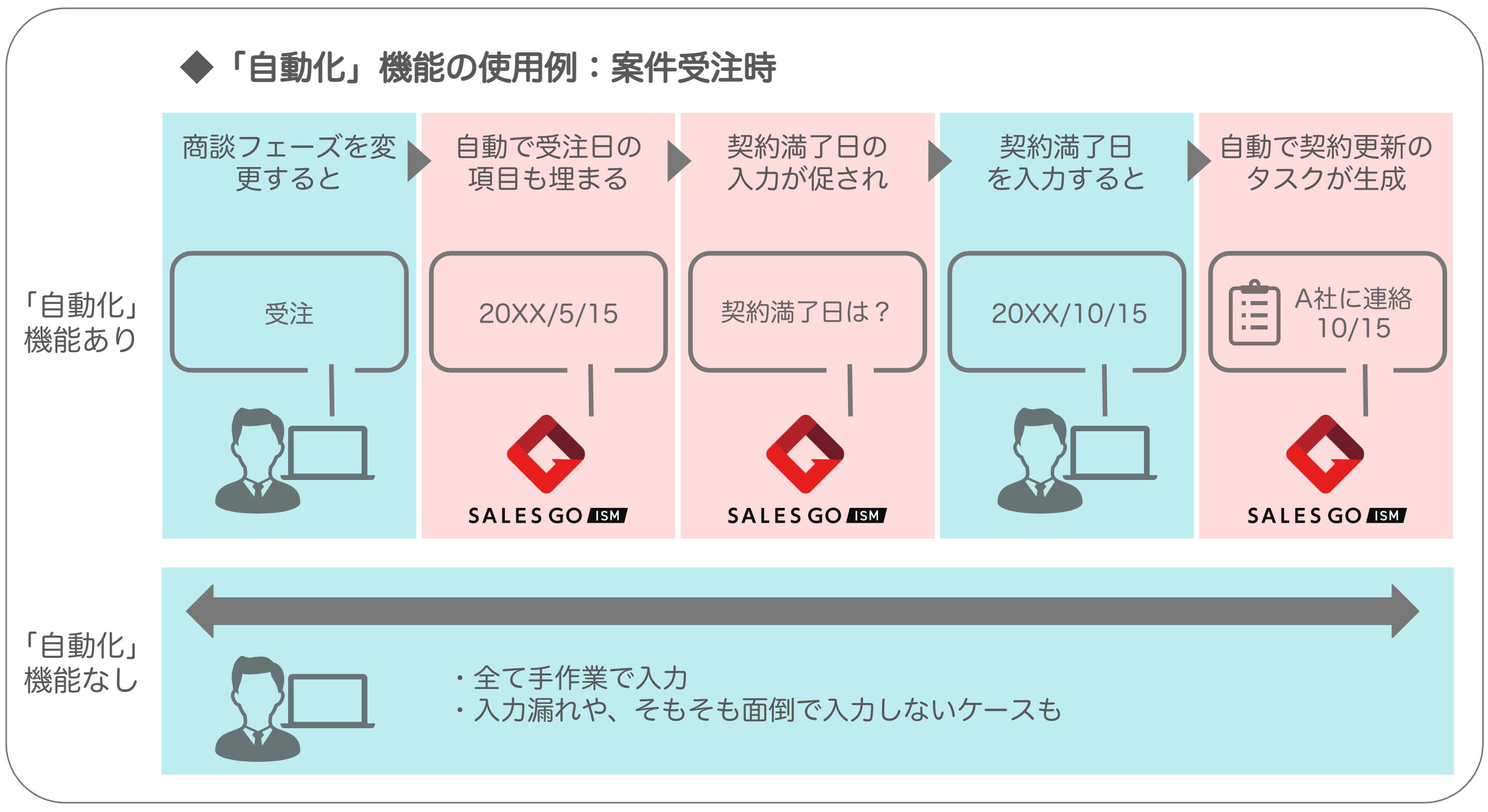 今回提供を開始する「自動化」機能は、これまで営業担当者が手作業で行っていた入力を最小限に抑え、連動する項目の入力や新タスク生成をツール側が自動で行う機能です。