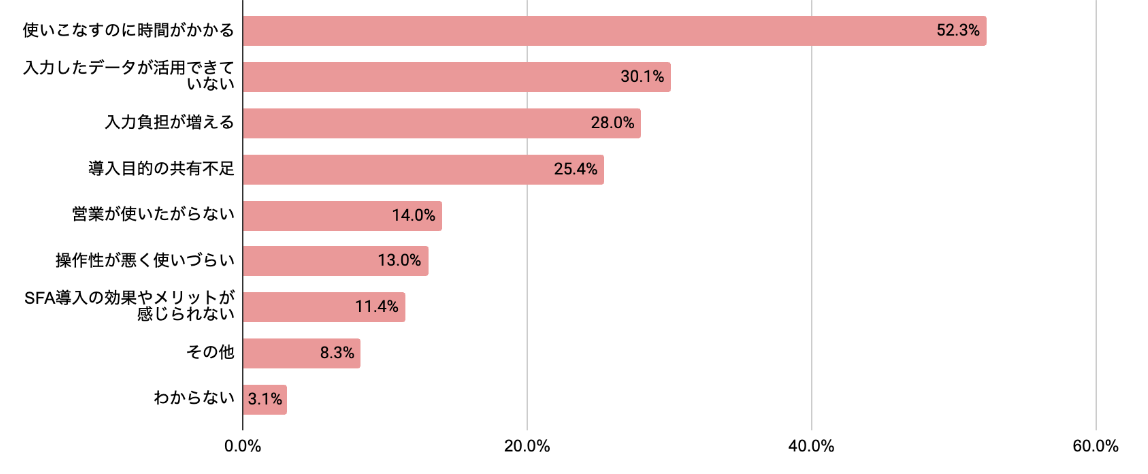 SFA導入後に機能を使いこなせていない理由として、1位「使いこなすのに時間がかかる」、3位「入力負担が増える」という調査結果※が出ています。日々の営業活動が入力されずデータとして蓄積されなければ、SFAを導入しても期待した効果が生まれないケースもあります。