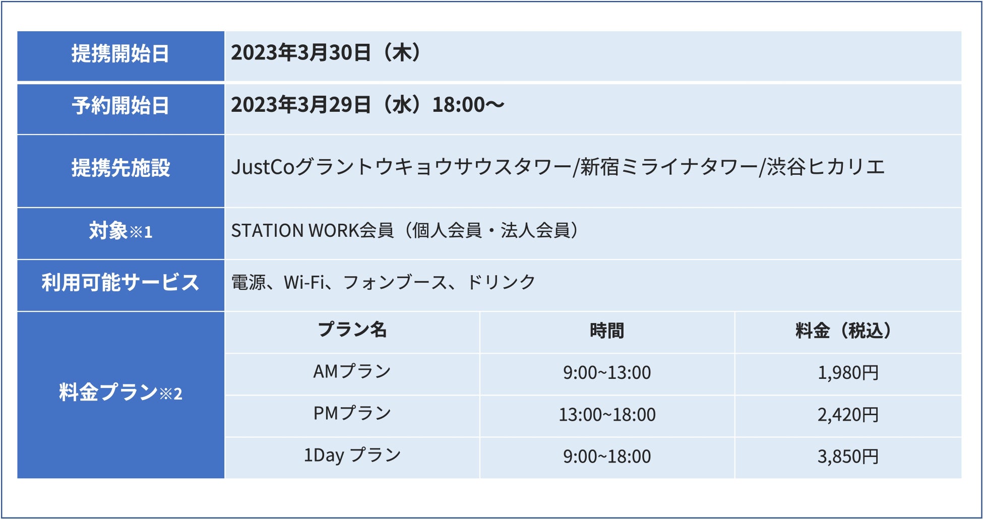 ※2 プラン詳細はSTATION WORK専用WEBサイトをご覧ください。支払方法は、STATION WORK専用WEBサイト登録済クレジットカードよる事前決済となります。