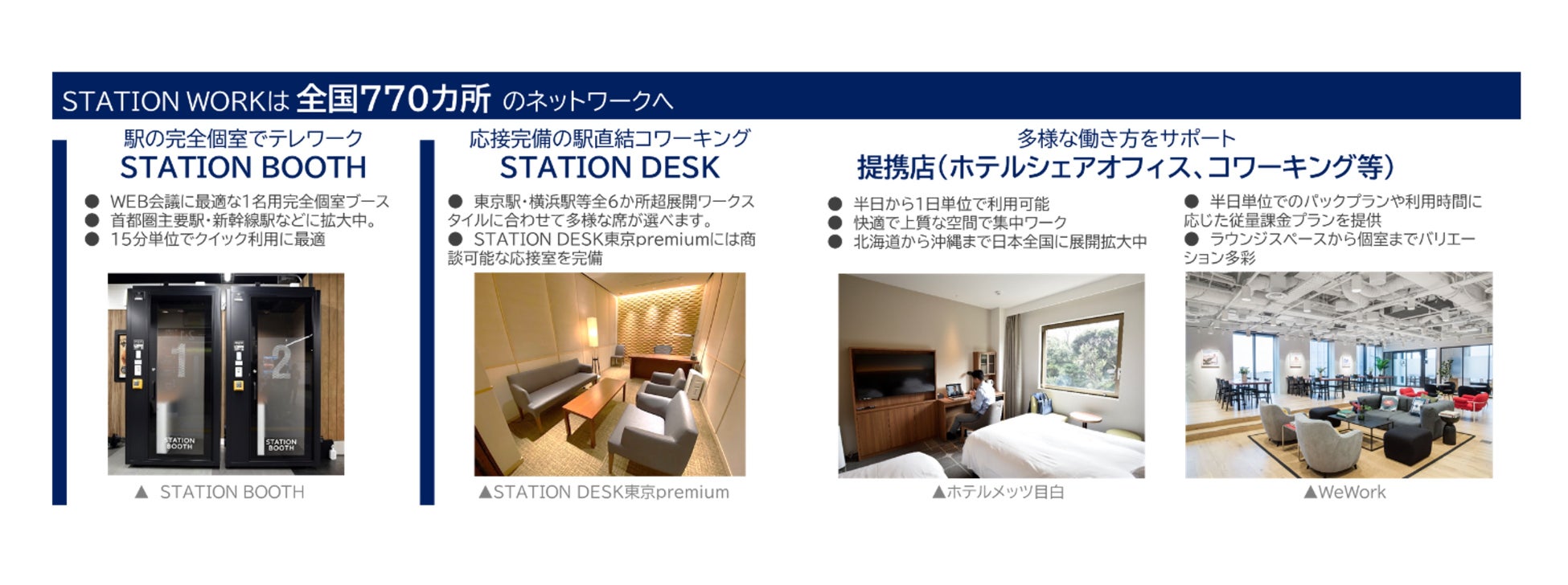 「STATION WORK」は、2019年8月にサービスを開始したJR東日本のシェアオフィス事業です。多様化する働き方をサポートするため、首都圏主要駅・新幹線駅に拡大している1名用完全個室ブース「STATION BOOTH」や、駅直結のコワーキングスペース「STATION DESK」、さらにコワーキングやホテルシェアオフィス等の「提携店」拡大を進めています。今回のJustCoとの提携により、拠点数は約770カ所となります。今後も日本全国にネットワークを拡大し2023年度1,000カ所展開を目指しています。https://www.stationwork.jp/