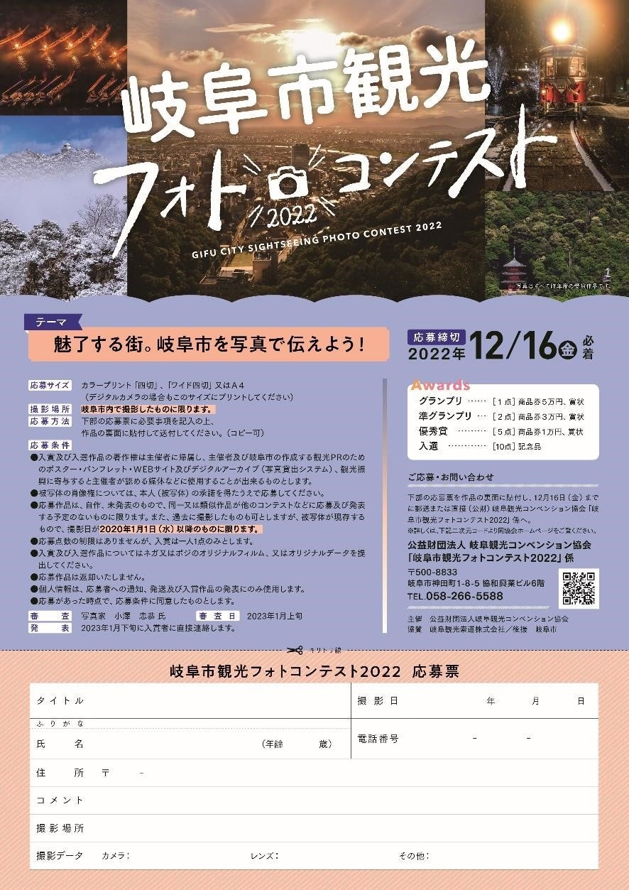 下部の応募票を作品の裏面に貼付し、12月16日(金)までに郵送又は直接(公財)岐阜観光コンベンション協会「岐阜市観光フォトコンテスト2022」係へ。