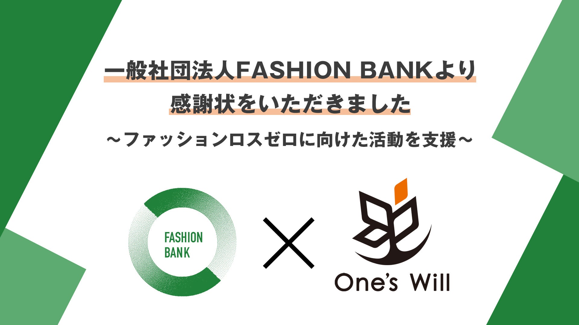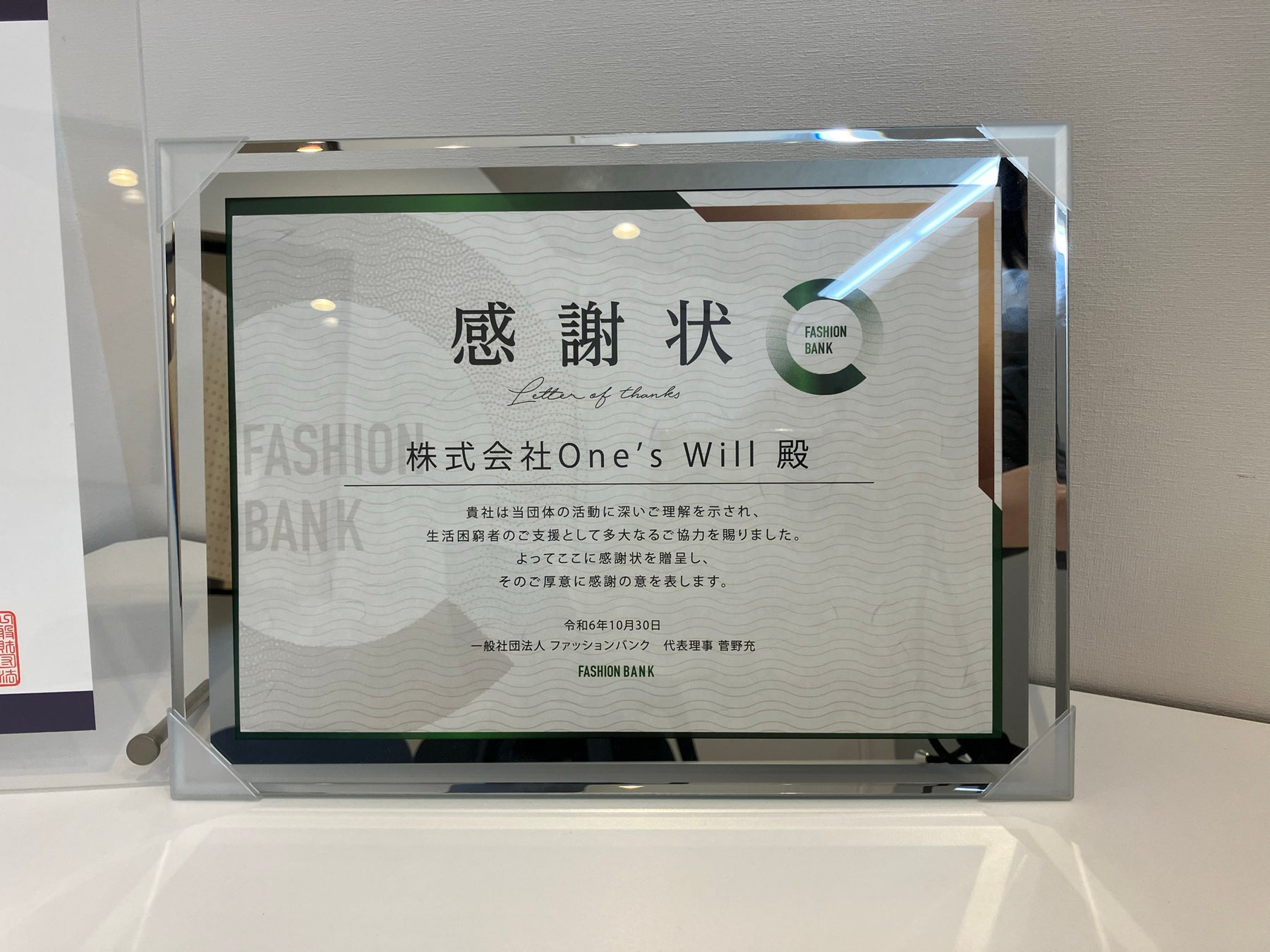 株式会社One's Will、一般社団法人FASHION BANKより感謝状を受領いたしました