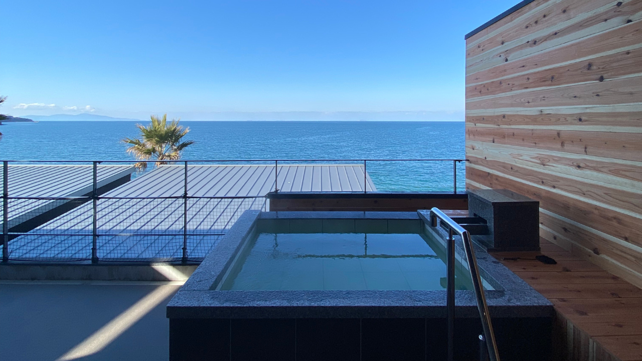 全天候対応型のテラスでは、雨天でもテラス内でBBQ等をお楽しみ頂けます。スイートタイプのお部屋のテラスには、ジャグジーを備え付けてあり、新たにラージ・スタンダードタイプの全部屋に露天風呂を新設しました。どのお部屋からも、海に浮かぶような景色をお楽しみ頂けます。