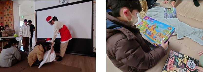 「様々な事情で体験機会が少なくなった子どもたちに思い出をつくる」をテーマとし、「子ども第三の居場所b&g大町」拠点にて、子どもたちが企画、実施するクリスマスパーティーとなりました。映画鑑賞やカラオケなどの個人発表、プレゼント交換などをして楽しみました。パーティーの最後にはサンタが登場し、パラダイス山元様、株式会社CrushOn様よりご寄付いただいた玩具を開封し、全員で遊ぶことができました。
