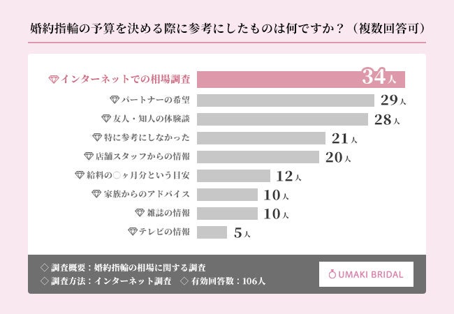 次に「婚約指輪の予算を決める際に参考にしたものは何ですか?(複数回答可)」と質問したところ、『インターネットでの相場調査』(34人)が1位となりました。続いて『パートナーの希望』(29人)が2位、『友人・知人の体験談』(28人)が3位にランクインしています。