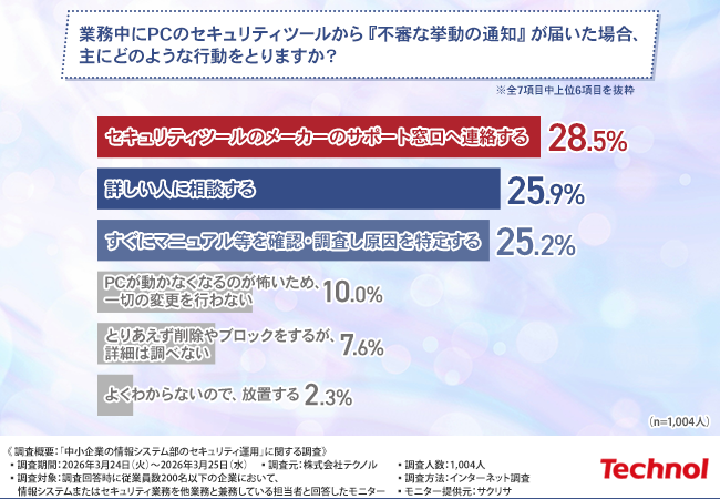 「業務中にPCのセキュリティツールから『不審な挙動の通知』が届いた場合、主にどのような行動をとるか」と尋ねたところ、『セキュリティツールのメーカーのサポート窓口へ連絡する(28.5%)』と回答した方が最も多く、『詳しい人に相談する(25.9%)』『すぐにマニュアル等を確認・調査し原因を特定する(25.2%)』となりました。