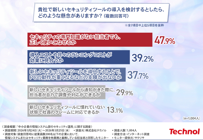 株式会社テクノル(所在地:青森県八戸市、代表取締役社長:千葉 哲也)は、従業員数200名以下の企業において、情報システムまたはセキュリティ業務を他業務と兼務している担当者を対象に、「中小企業の情報システム部のセキュリティ運用」に関する調査を実施しました。