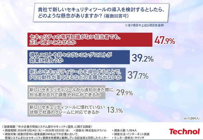 「貴社で新しいセキュリティツールの導入を検討するとしたら、どのような懸念があるか」と尋ねたところ、『セキュリティの専門知識がない担当者でも、正しく使いこなせるか(47.9%)』と回答した方が最も多く、『導入コストや月々のランニングコストが効果に見合うか(39.2%)』『新しいセキュリティツールを導入することで、PCの動作が重くなるなどの支障が出ないか(37.7%)』となりました。