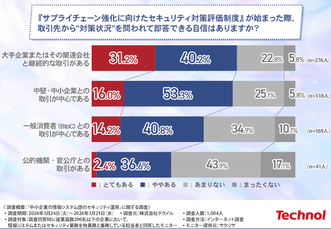 「『サプライチェーン強化に向けたセキュリティ対策評価制度』が始まった際、取引先から“対策状況”を問われて即答できる自信はあるか」と尋ねたところ、取引先の属性別で以下のような回答結果になりました。