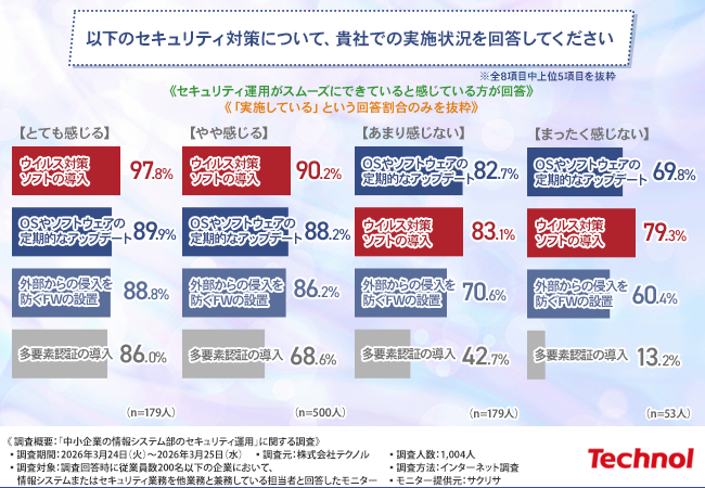 「ウイルス対策ソフトの導入」や「OSやソフトウェアのアップデート」といった基礎的な対策が徹底できているかどうかが、運用全体に対する自信になっていると考えられます。