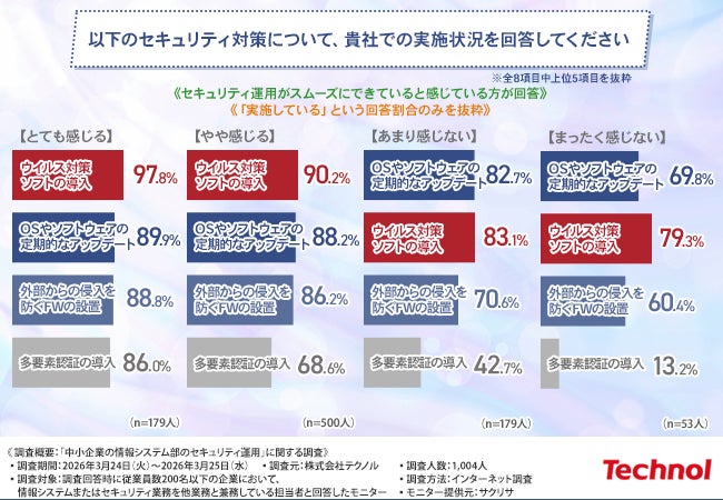 「以下のセキュリティ対策について、貴社での実施状況を回答」と尋ねたところ、セキュリティ運用の実感別で以下のような回答結果になりました。