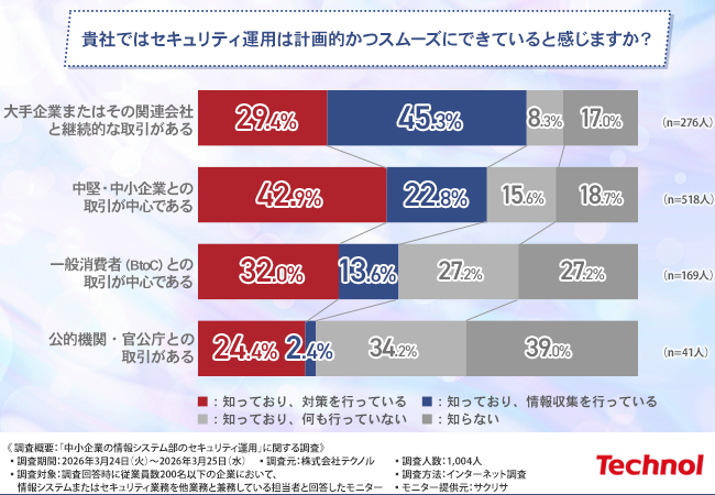 今回の調査で、従業員数200名以下の企業におけるセキュリティ運用は、取引先の属性によって差が生じている実態が浮かび上がりました。