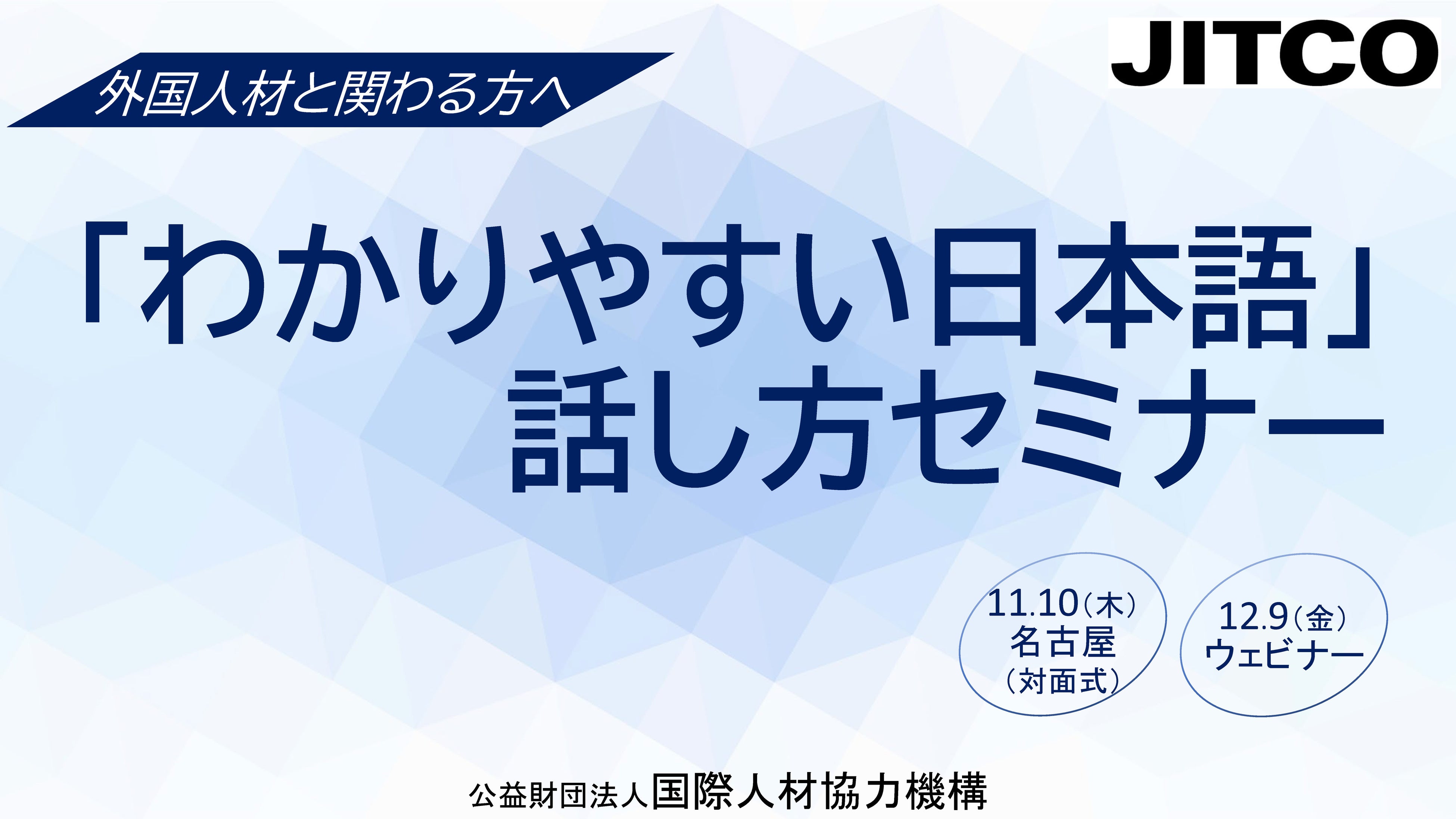 公益財団法⼈国際⼈材協⼒機構(JITCO・ジツコ、所在地:東京都港区、理事⻑:⼋⽊ 宏幸)は、外国人技能実習生や特定技能外国人などの外国人材を受け入れている企業や団体など、外国人材と接する機会のある皆様に向けて、「わかりやすい日本語」の話し方のコツを掴んでいただくセミナーを開催します。