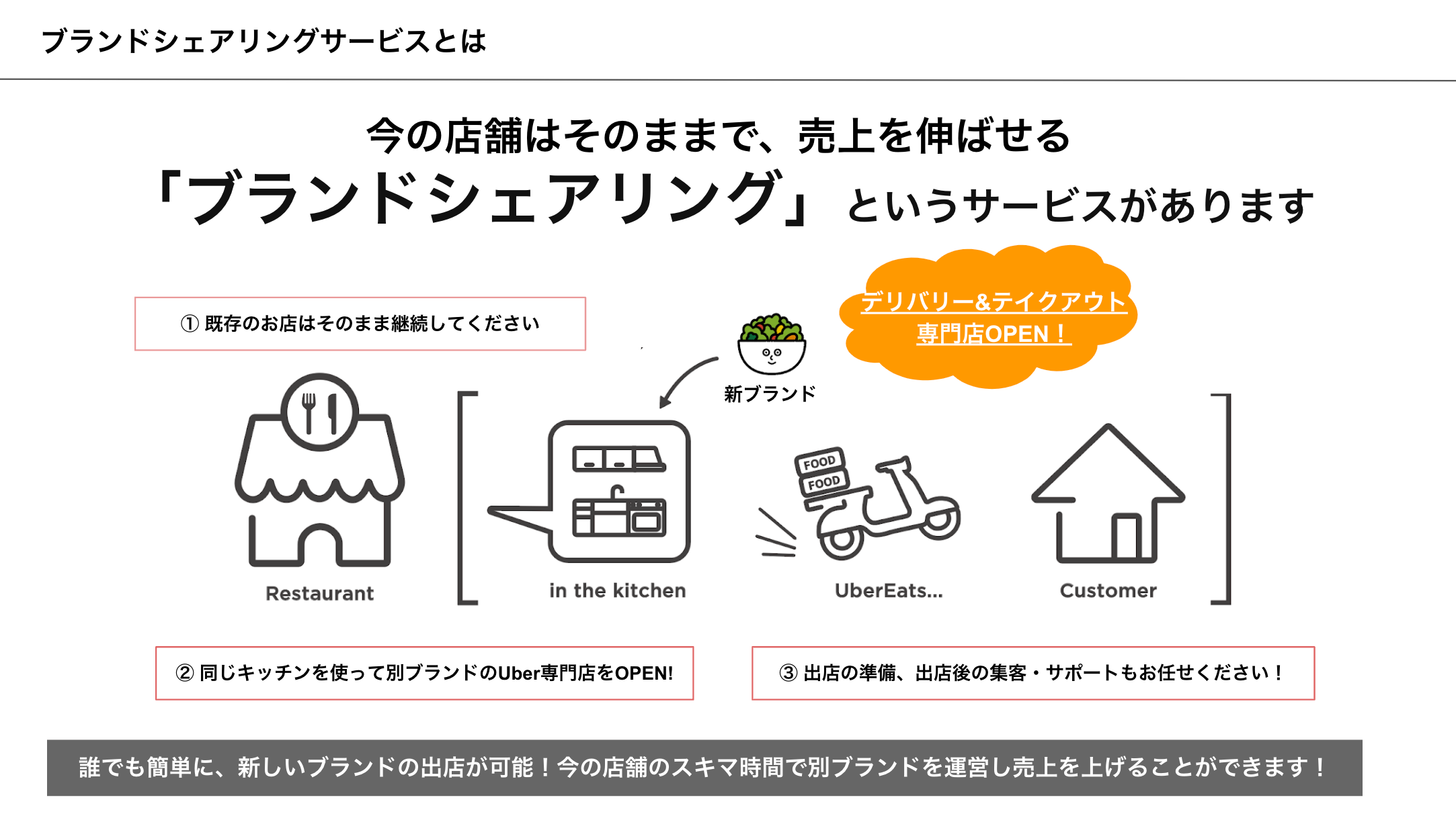 今の店舗はそのまま運営をしながら、Uber Eatsや出前館などのデリバリーサービスを活用し、新たなブランドを運営することで、売上を最大化させていく飲食店の新しいビジネスモデルです。