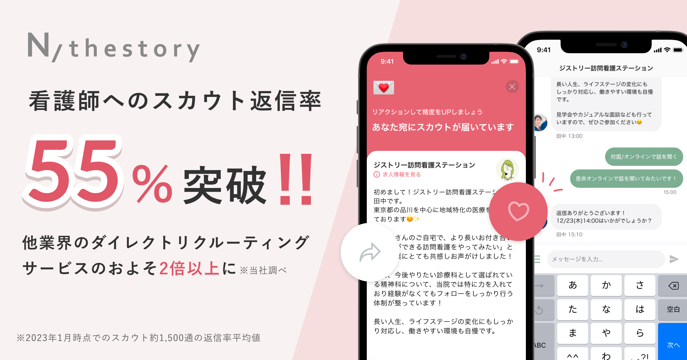 株式会社thestory(ジストリー)(本社:福岡県糸島市、代表:河京子 / 山本遼太郎)が運営する看護師の採用マッチングアプリ「N/thestory(ジストリー)※以下N/thestory」は、医療機関等が看護師へ送るスカウトメッセージへの平均返信率が、昨年9月時点から約5%増加して、55%以上となったことをお知らせいたします。他業界のダイレクトリクルーティングサービスにおける平均返信率は約20%(自社調べ)となっており、「N/thestory」に登録いただいている看護師のスカウトメッセージ返信率がそのおよそ2倍以上であること、またサービス利用者の増加に伴ってさらに増加していることがわかりました。