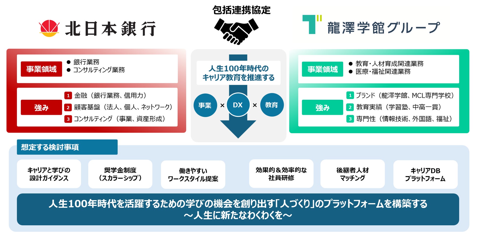 「豊かな人間力と創造的開発力で、未来をデザインする“ユニークバンク”」を10年ビジョンに掲げる北日本銀行と「岩手の未来を創造し、リードする人材育成」を使命とし、高い専門性と確かな実績を誇る教育機関の龍澤学館グループが相互に連携し、地域の雇用・人材育成に関連する課題解決への貢献を通じて、地域経済活性化と持続的かつ発展的な社会の実現を図ることを目的とする。