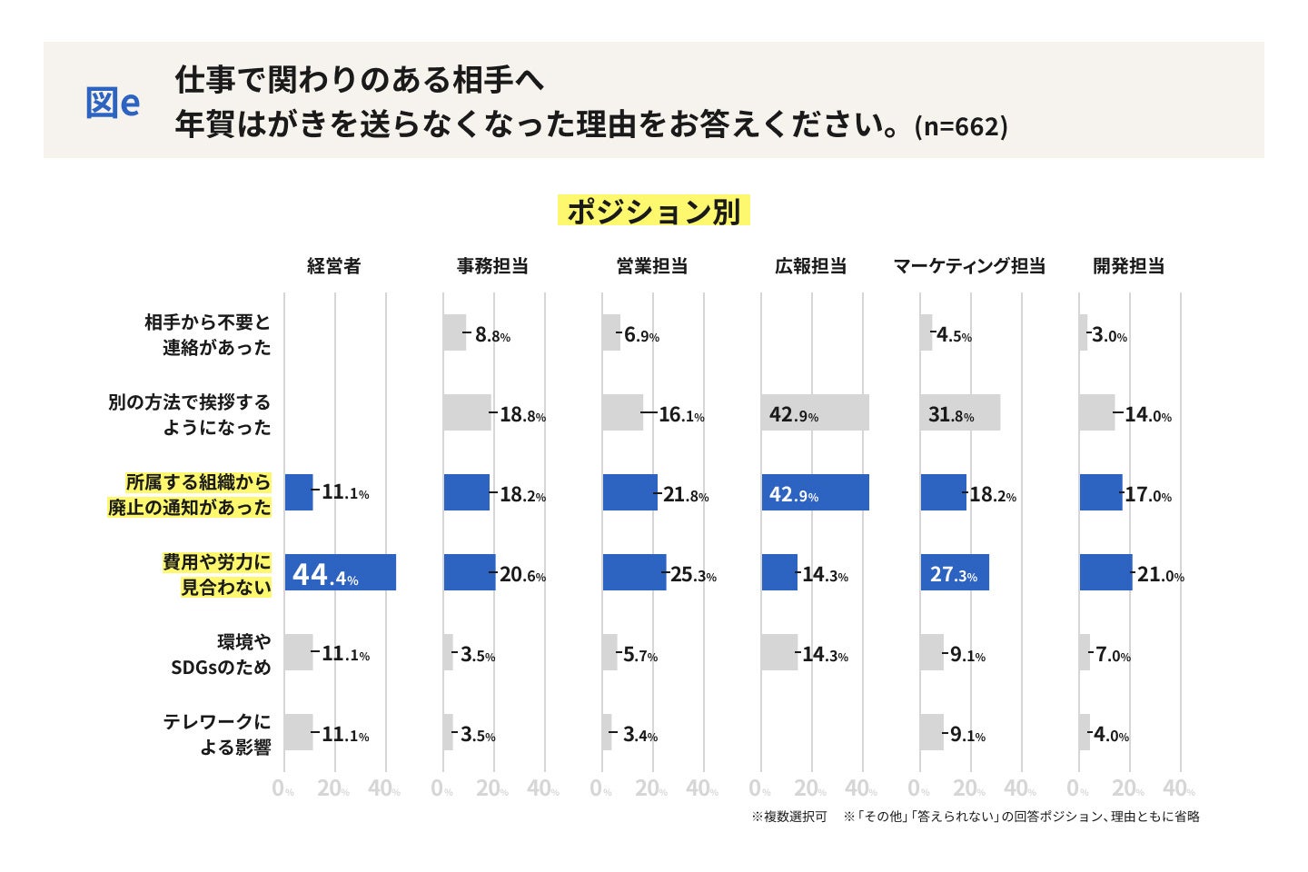 さらに、「いつから年賀はがきを送っていないか」を尋ねたところ、「2019年以前から送っていない」との回答が14.7%でした。ポジション別でみると、広報担当を介して出していた年賀はがきは2021年に6割近くが「送らない」と判断したことが分かり、リモートワークや勤務体制の変化など、間接的にコロナ感染拡大の影響を受けたことが窺える結果となりました。