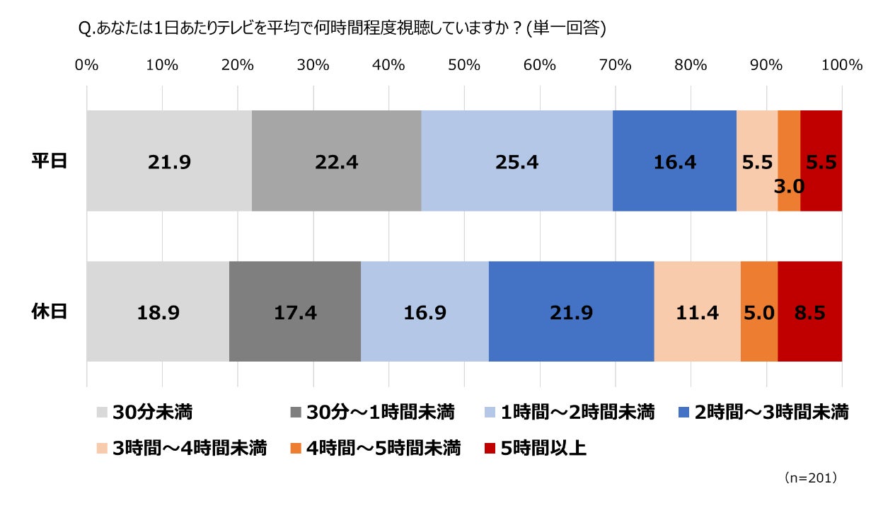 平日/休日ともに約4割が「1日あたりのテレビ視聴1時間未満」と回答