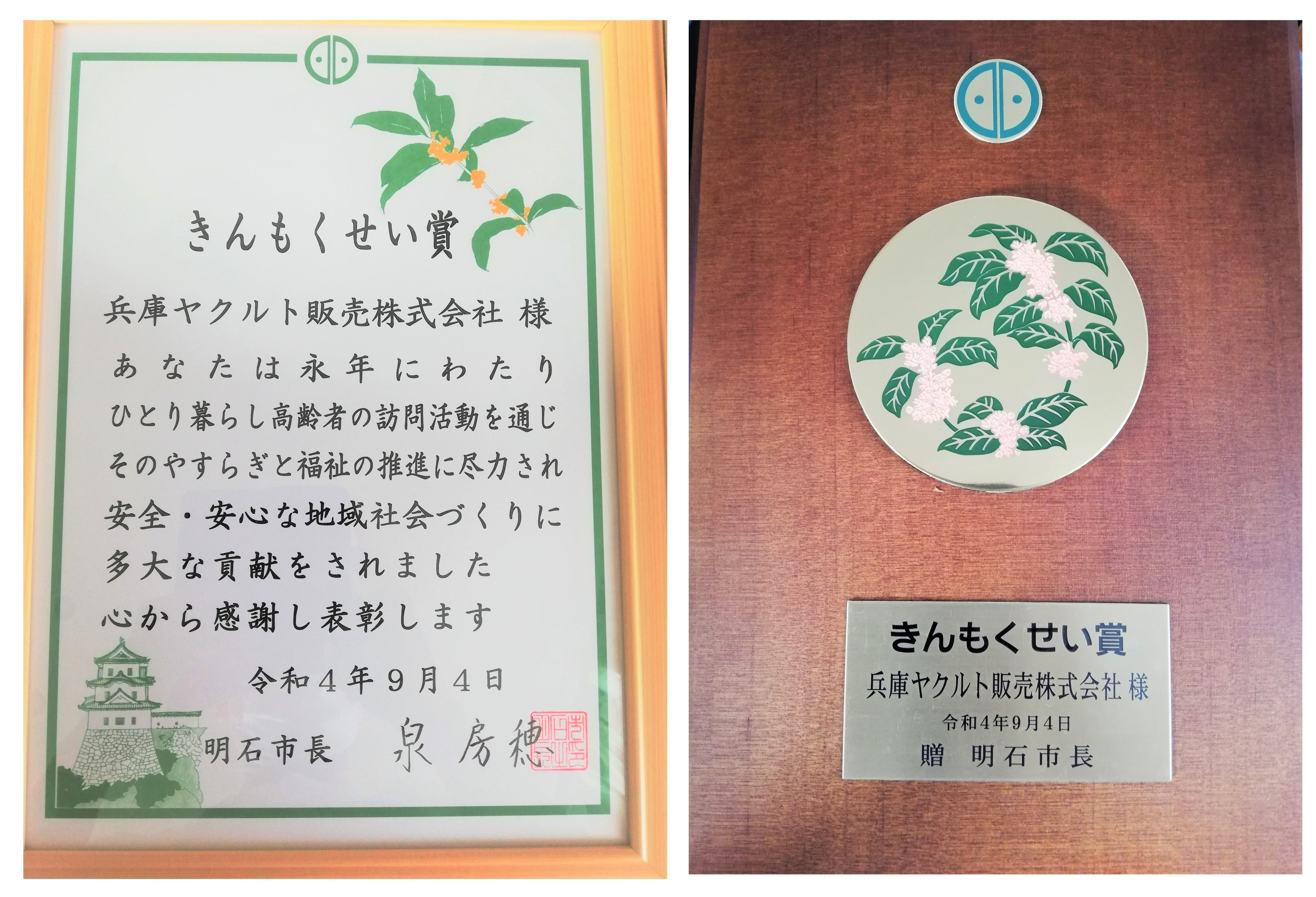 兵庫ヤクルト販売株式会社は、令和4年9月4日(日)に明石市より、令和4年度明石市「きんもくせい賞」をいただきました。高齢者の生きがい促進や健康福祉活動などの多様な地域貢献活動が、ぬくもりとやすらぎのある明石のまちづくりに寄与するものと認められ、この度の賞を贈呈いただきました。