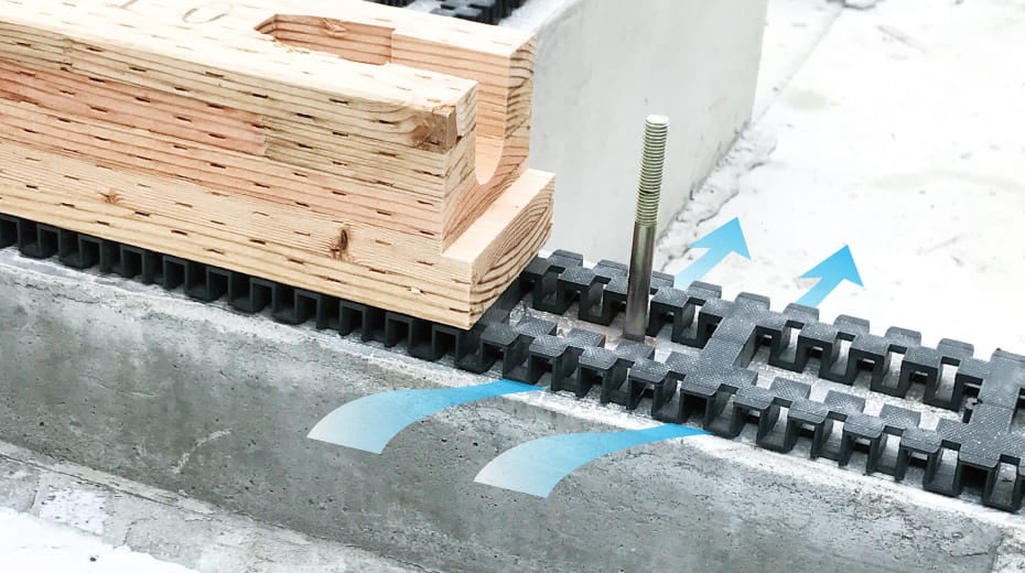 床下の空間の湿度を一定以下に管理し、気密、断熱化を図ります。コンクリート基礎と土台(木構造)との間に部材を挟み、換気効率を高めます。