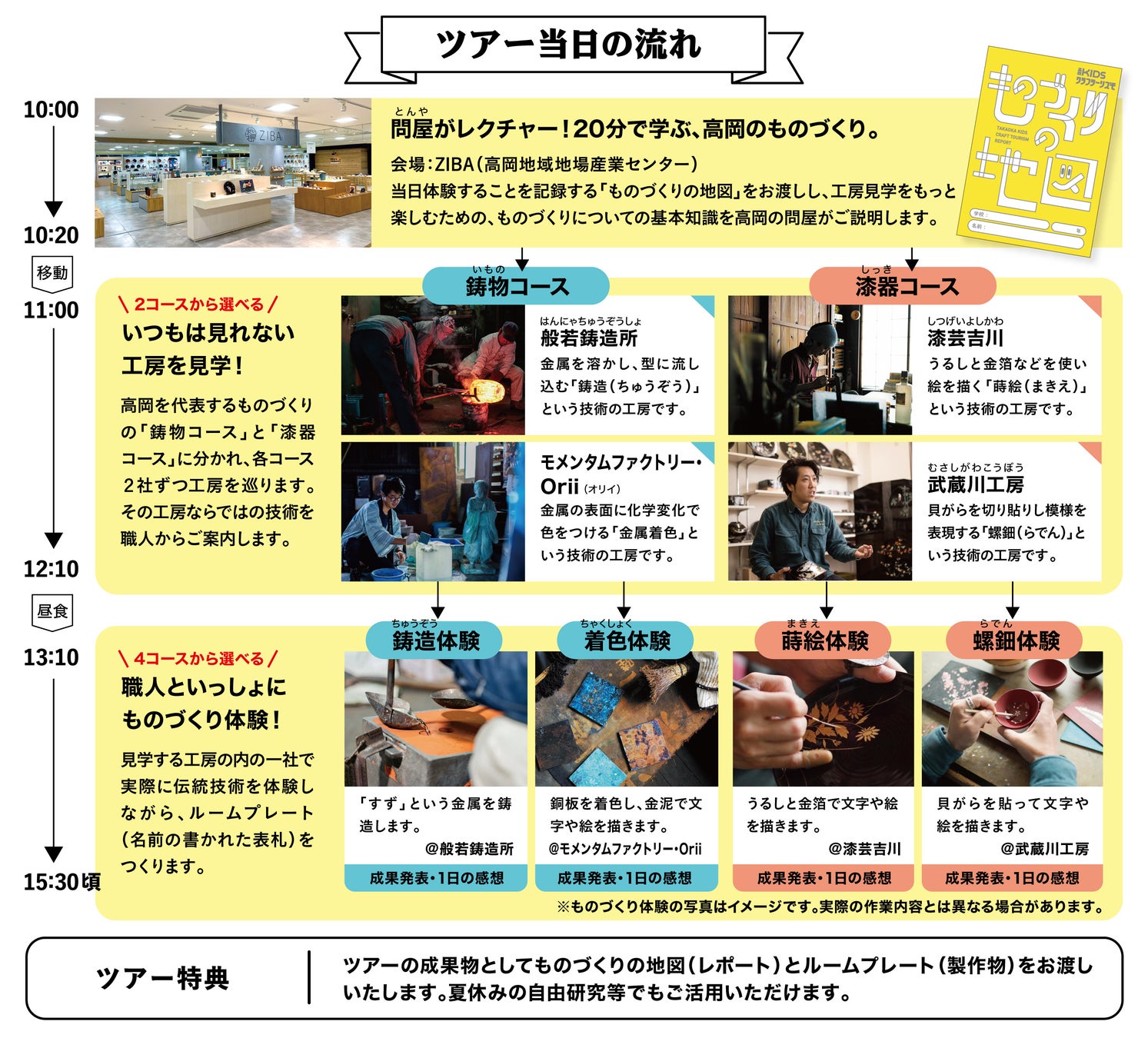 高岡が世界に誇る技術がつまったこだわりのルームプレートを製作する過程で職人の仕事を体験する企画となります。また、自由研究のレポートとして提出できるよう、当日体験することを記録する「ものづくりの地図」を用意。工房見学をもっと楽しむための、ものづくりについての基本知識を高岡の問屋が説明します。本企画は、鋳物コースと漆器コースの4コース・24名限定で、定員になり次第締め切りとなります。(申し込み URL:https://forms.gle/kdqUXZDQvb2qutDT7 )