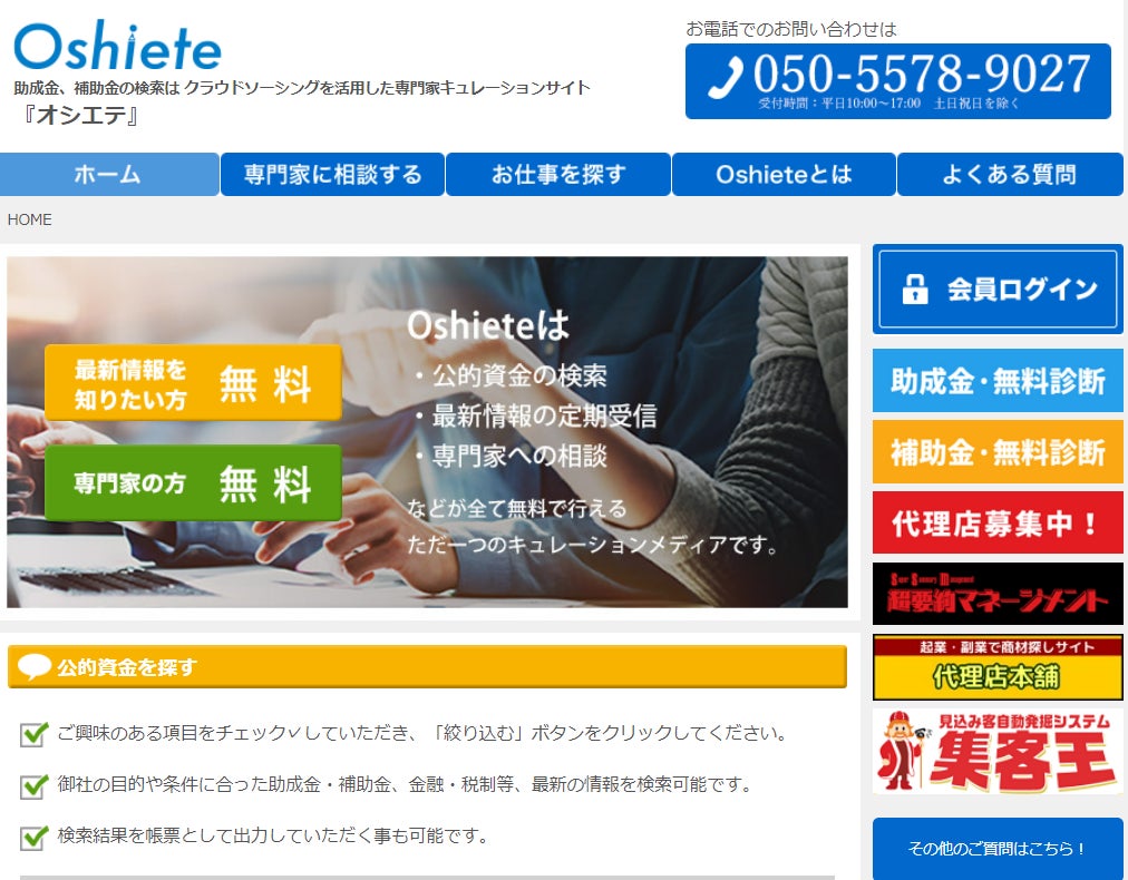 oshieteは返済不要な公的資金(助成金、補助金など)の申請をサポートする専門家をご紹介する団体です。