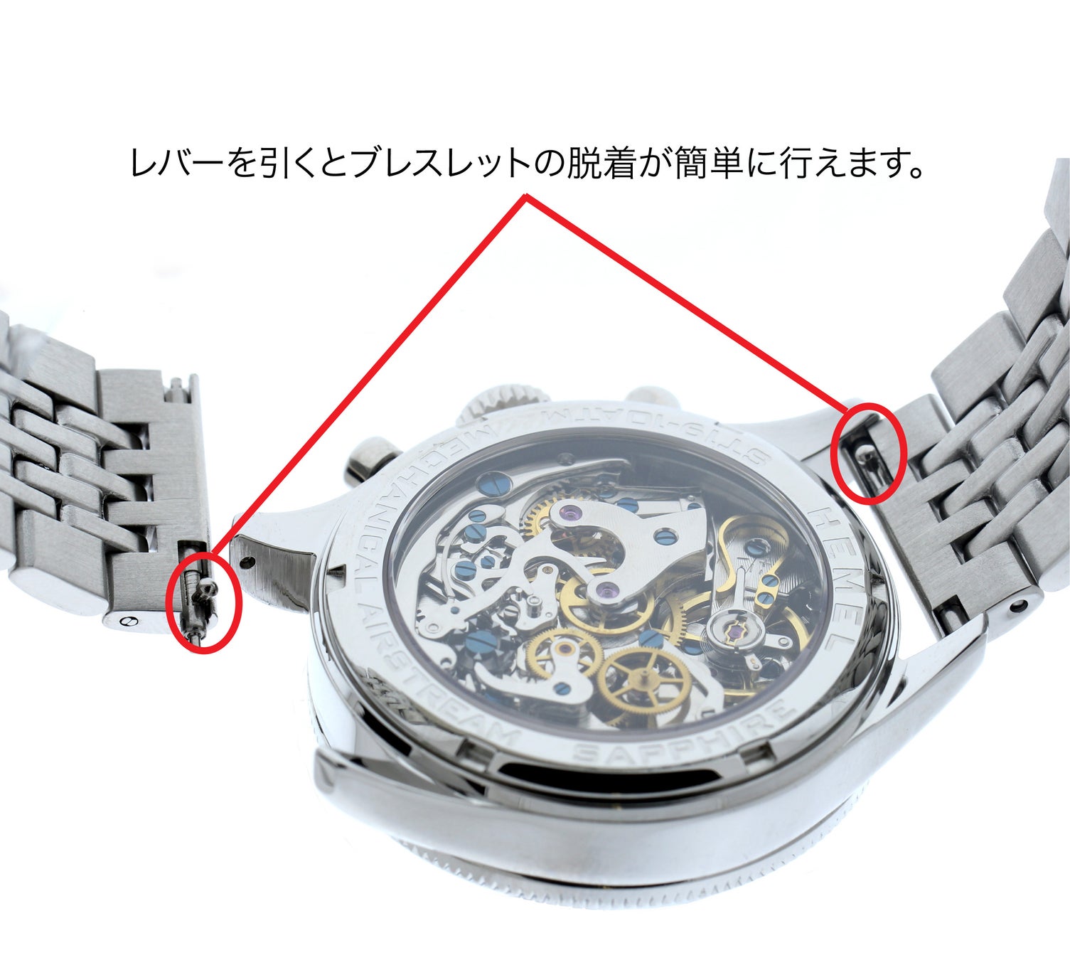 HEMELオリジナルのメタルブレスレットはクイックチェンジ仕様になっており、裏側のレバーを引くとブレスレットの取外しが簡単に行えます。近日発売予定の別売りのHEMELオリジナル レザーストラップ(クイックチェンジ仕様)との交換も容易です。