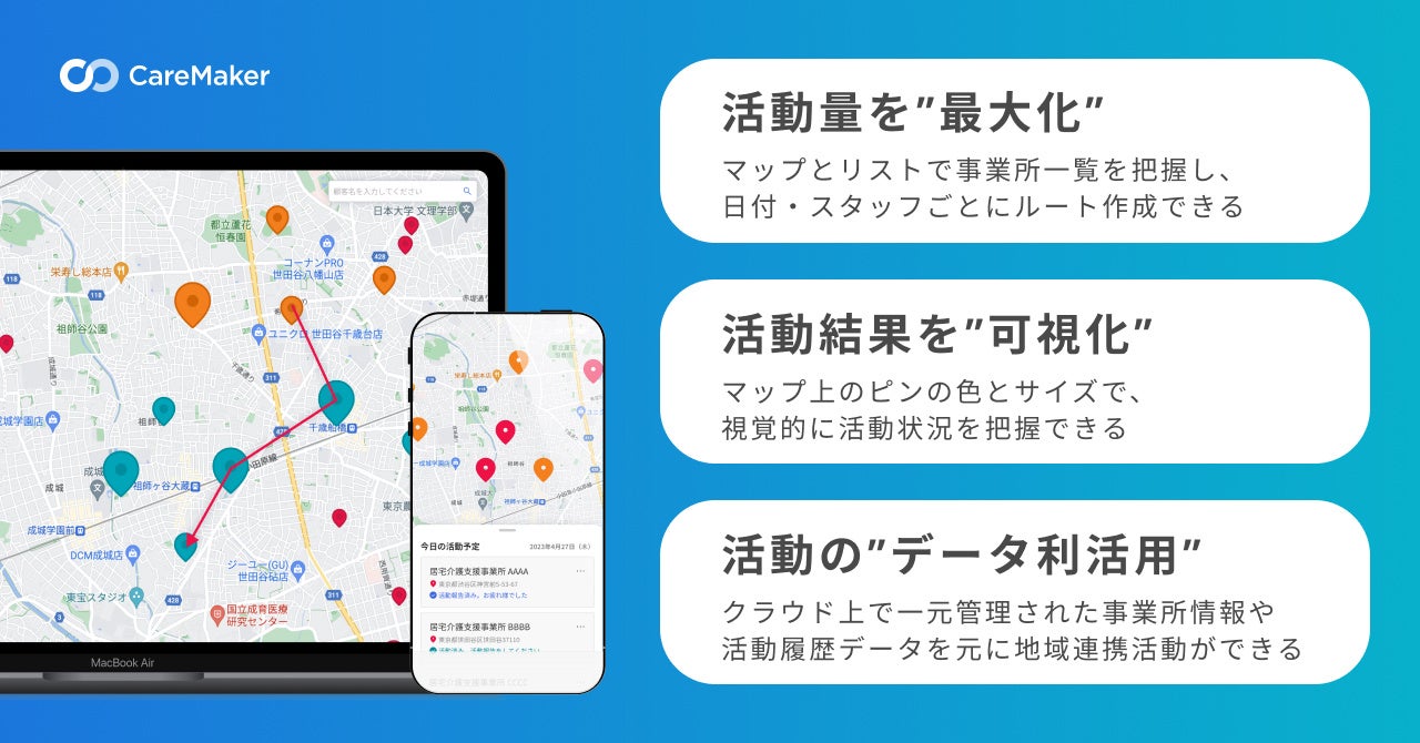 また、訪問看護・介護向けスケジュール管理クラウド「CareMaker」に、地域連携・多職種連携(※1)に必要な顧客管理をはじめとする各種機能を搭載し、「地域連携クラウド」へと大幅にアップデートいたしました。これにより訪問看護・介護などサービス提供事業所が営業・依頼・調整・提供といった地域連携に必要な一連の業務を効率化し、人材不足な福祉・介護業界において、より多くの利用者にサービスを提供することを支援します。
