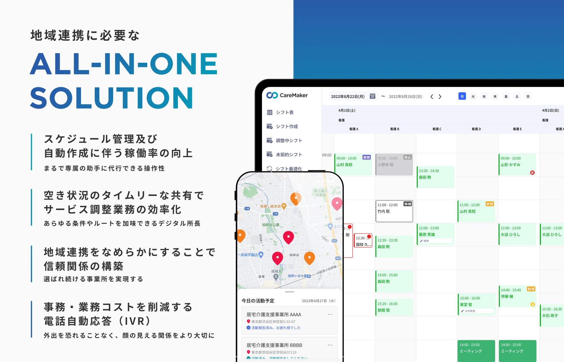 こうした声を受けて、CareMakerは “1人でも多くの方を看る”機会を最大化することを目的に、スケジュール管理及びサービス調整の自動化にとどまらず、地域連携・多種職連携(※2)から顧客管理まで一気通貫で完結させることができるオールインワンサービスへとアップデートする運びとなりました。