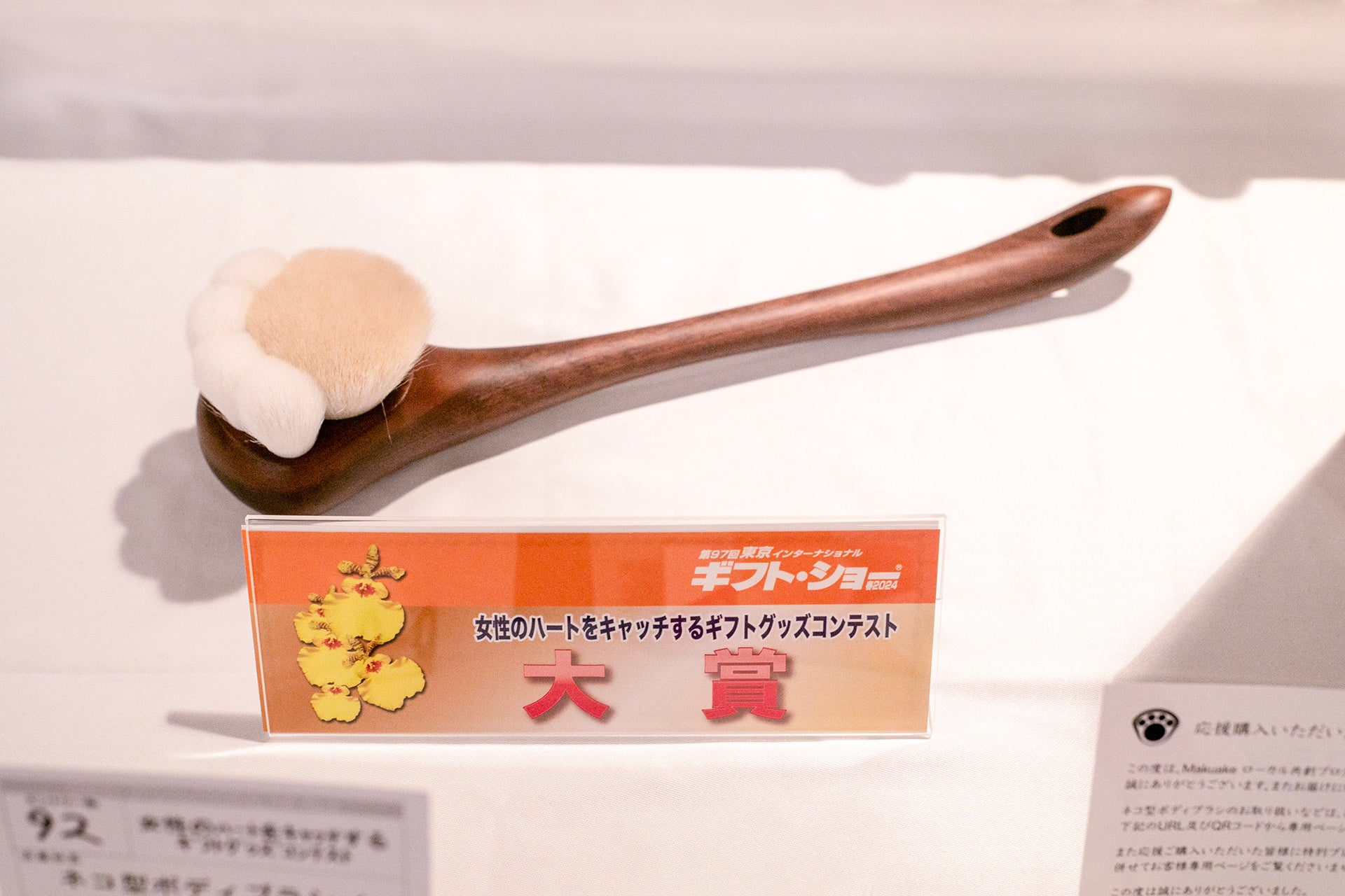 「コンテストには約200社が応募。その中からコンテスト大賞に選ばれたことには驚いたが、その他4つのコンテスト併せて800社の商品の中から選ばれるグランプリには手に届かなかったので、次回また可愛い商品を出展したい」と、ネコ型ボディブラシをデザインした土井健嗣(土井木工株式会社 専務取締役)は意気込んだ。