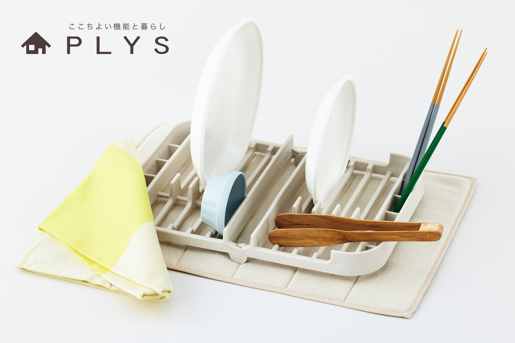 「プリスベイス 水切りラック」は、約2人分の食器を、コンパクトに乾かせる水切りラックです。使わない時に半分に折りたたんで収納できる、省スペース設計。お皿やお椀をしっかり立てられる構造で、お箸やスプーンなども立てられます。また、使わない時は、ふきんや「プリスベイス 水切り吸水マット」を乾かすスタンドとしても活躍します。