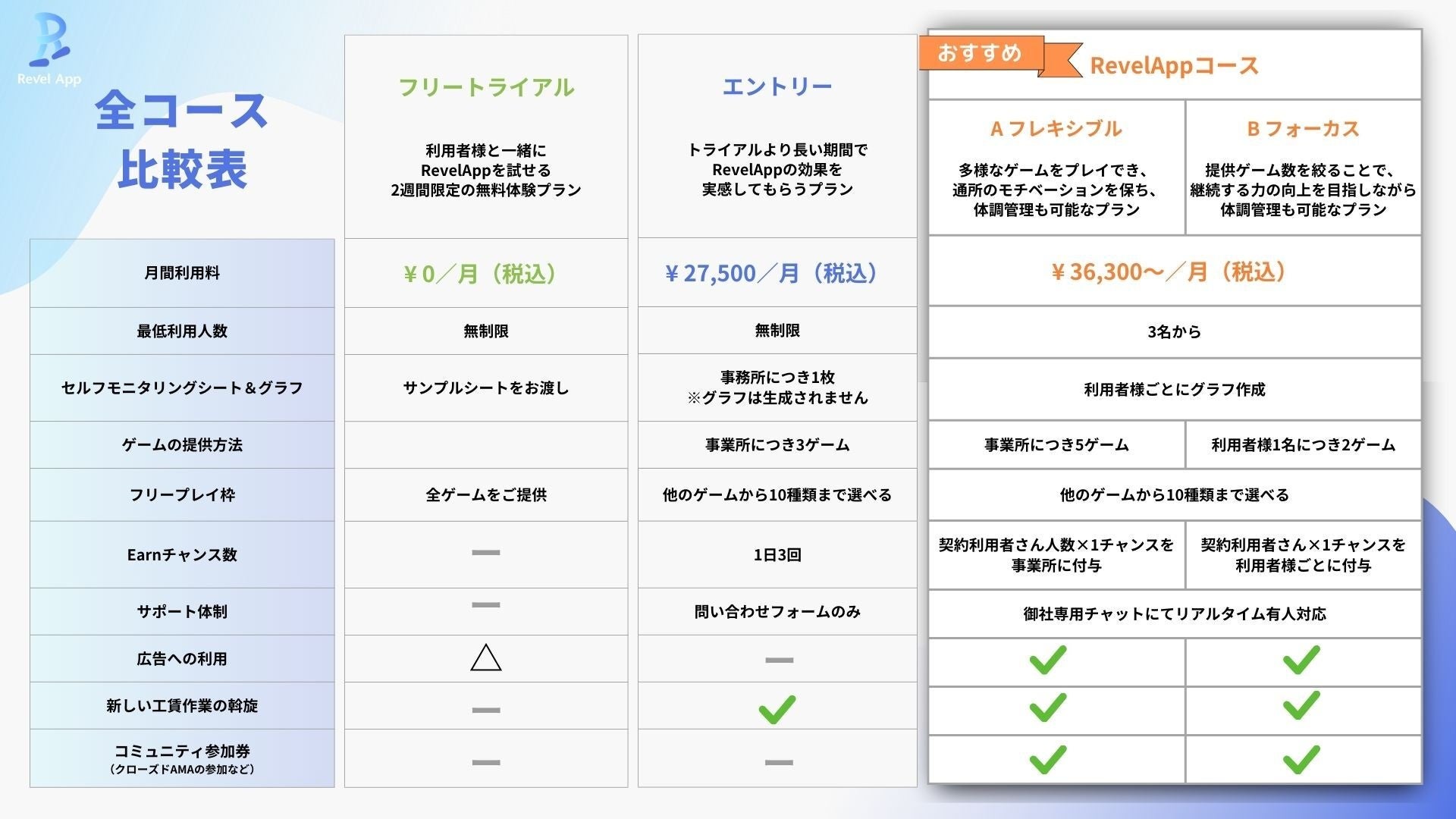 特に「RevelAppコース」は施設様ニーズに合わせてカスタマイズしやすいよう、2つに分岐します。