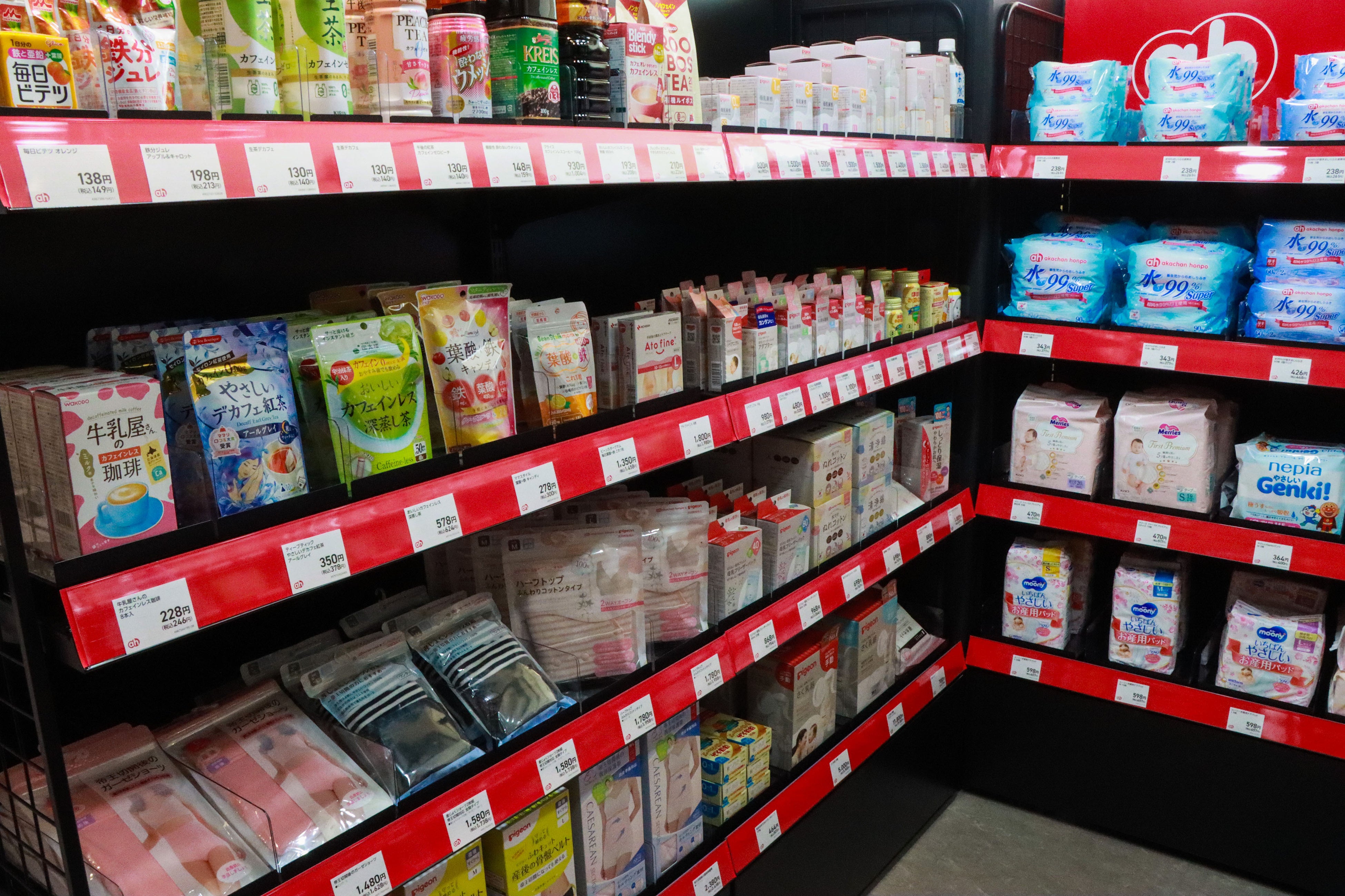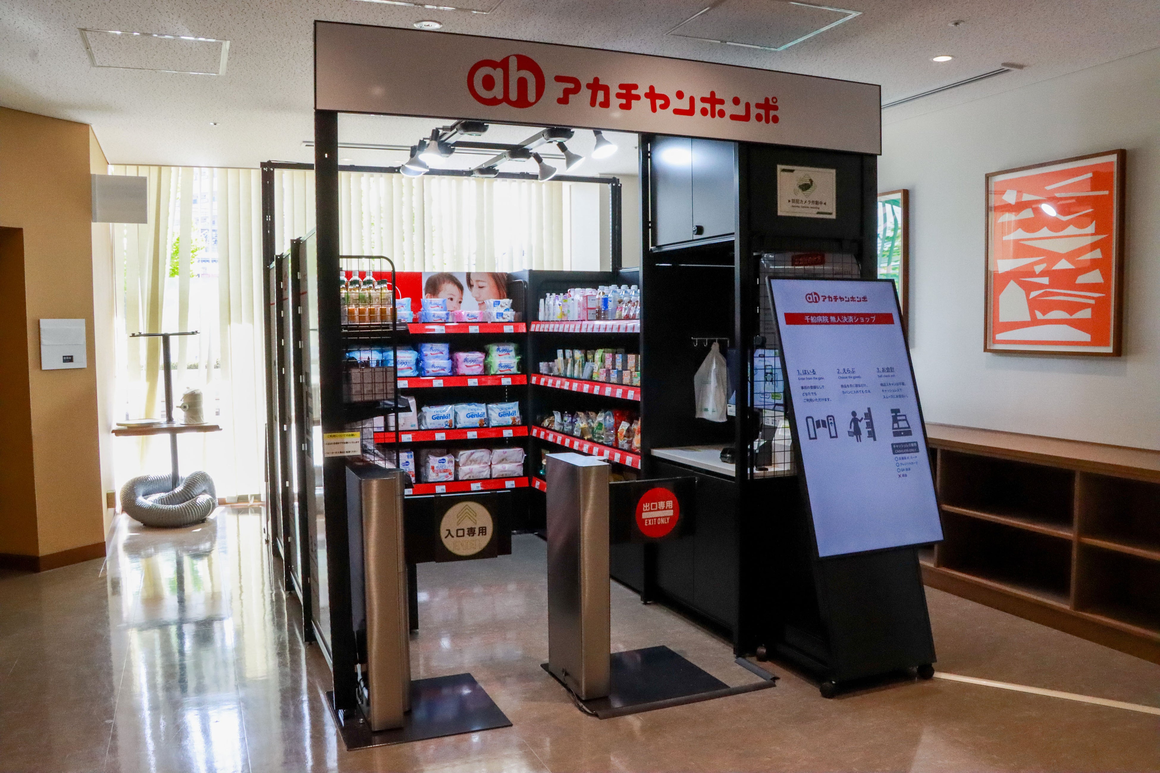 「アカチャンホンポ」の無人決済ショップは、大阪市の千船病院の1階に設置、産前産後に使用する商品や生まれた後すぐに使うおしりふき、ミルクなどの緊急性が高い商品に加え、ベビーフードやベビー飲料などをラインナップしました。