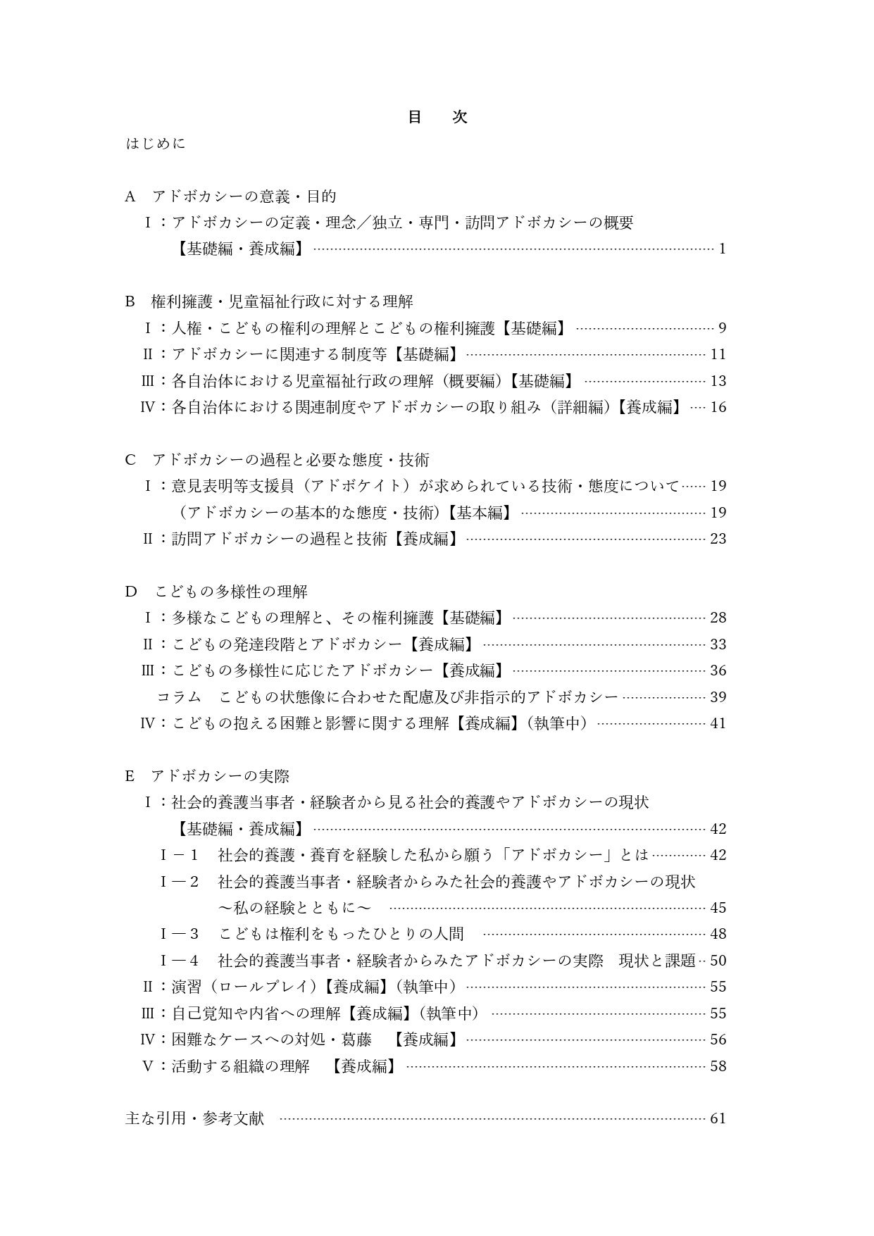 「アドボカシーの意義・目的」「権利擁護・児童福祉行政に対する理解」「アドボカシーの過程と必要な態度・技術」「こどもの多様性の理解」「アドボカシーの実際」について理解を深められる内容となっています。