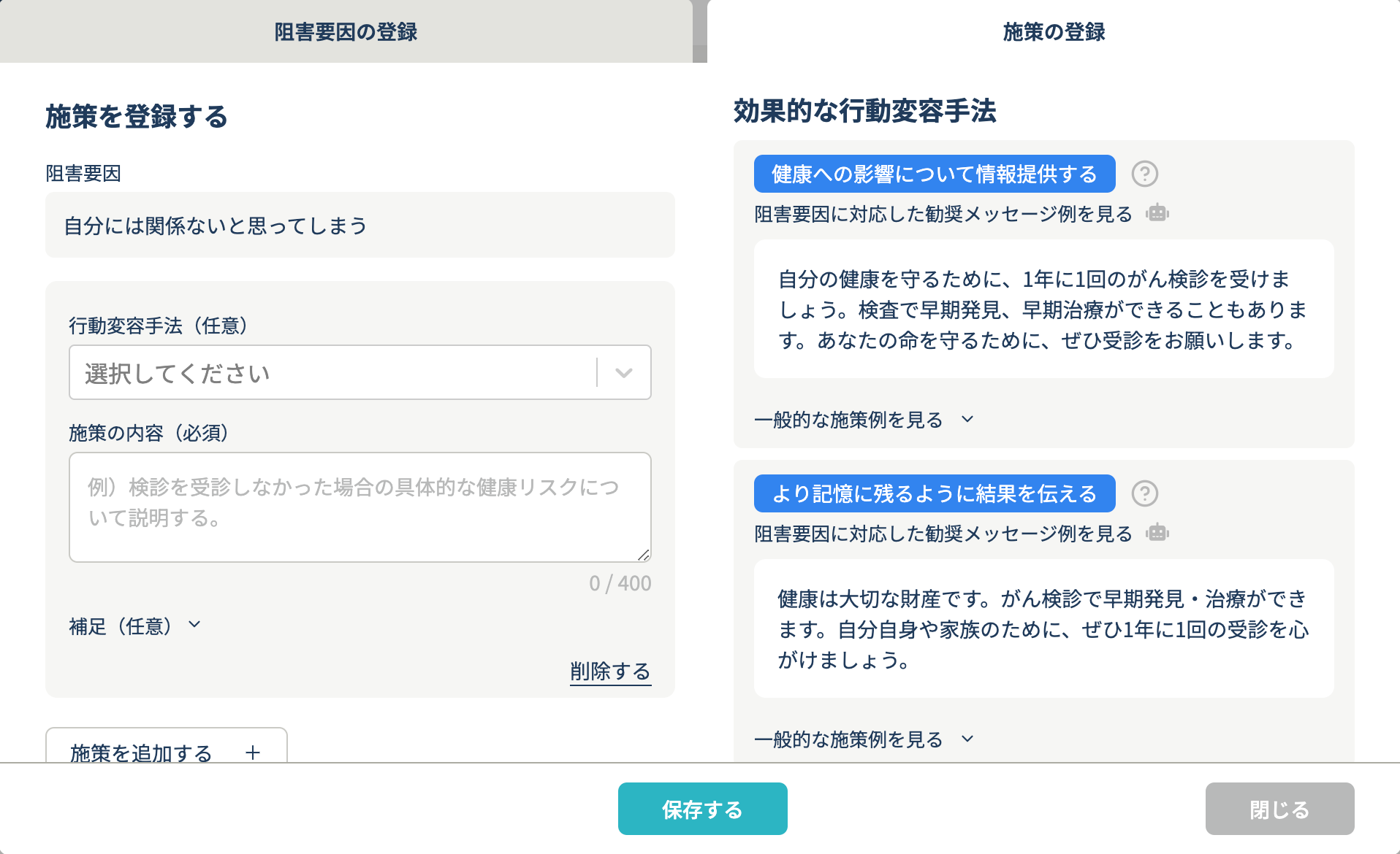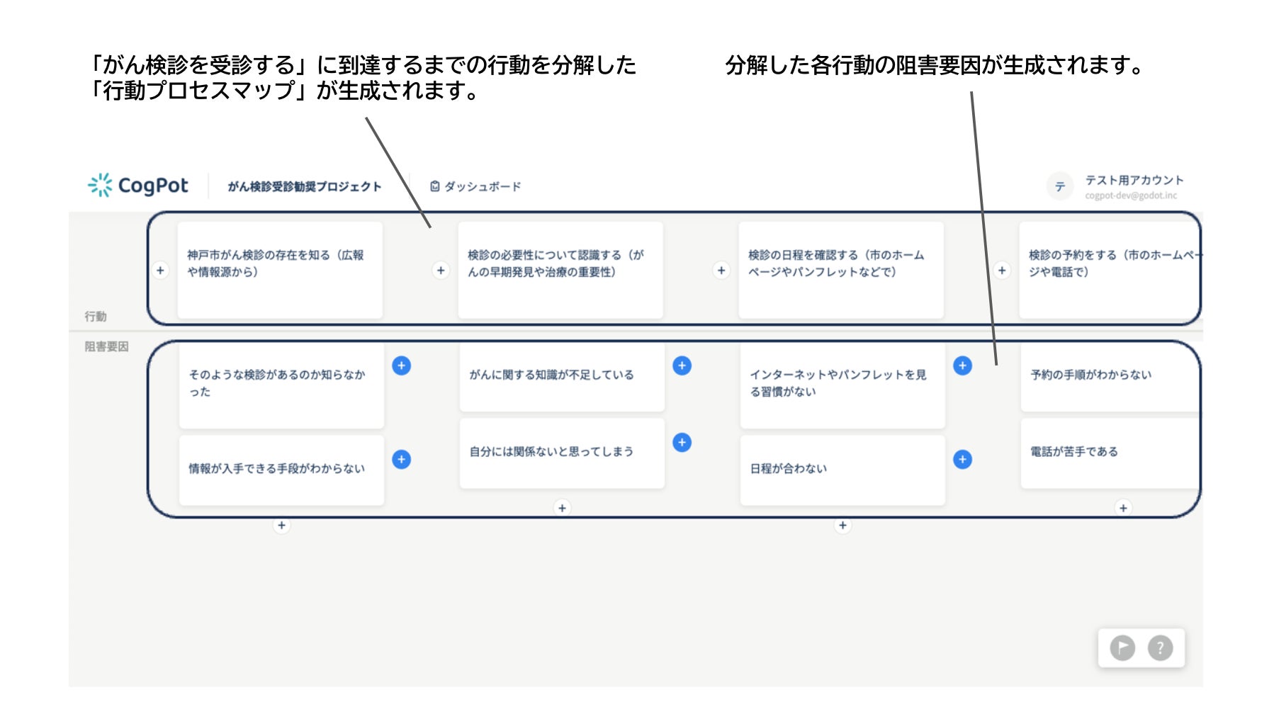 促したい行動目標を一行入力すると、およそ1分後に行動プロセスマップ(※図1)、各プロセスにおける阻害要因、各阻害要因に紐付く推奨行動変容手法、各行動変容手法に基づくコンテンツ例(※図2)が自動生成されます。