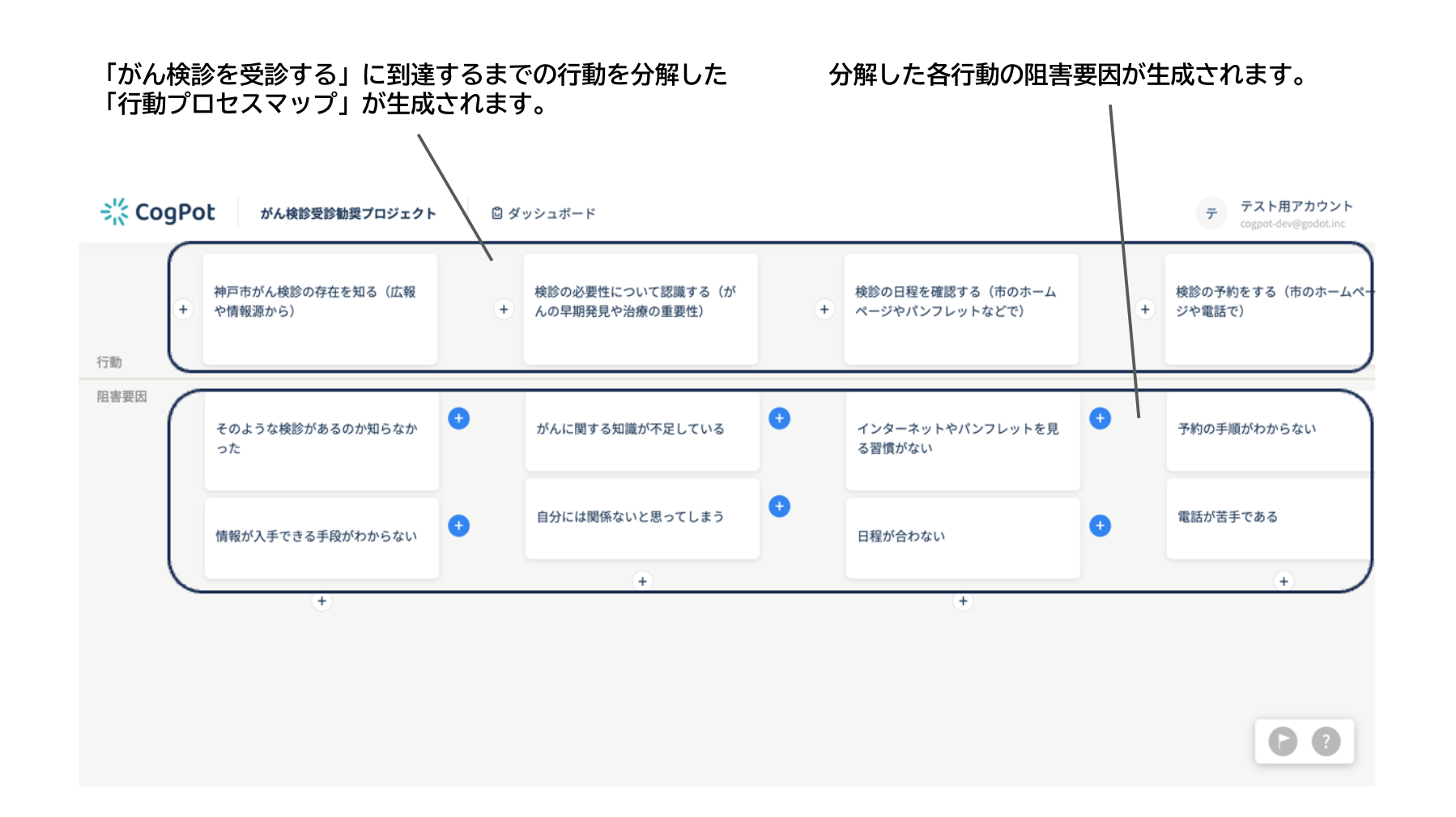 ※1 行動プロセスマップは、施策の対象となる方々に取ってもらいたい行動を目標として、最終目標までに必要な手順・行動を時系列で整理したものです。 この手法は行動科学的介入の検討をする際に一般的に使われており、目標までの阻害要因を明らかにし、それらを解決する施策を検討する上で役立ちます。Godotでは、行動プロセスマップで行動プロセス-阻害要因-行動変容手法-施策案(コンテンツ例を含む)を体系的に整理しています。