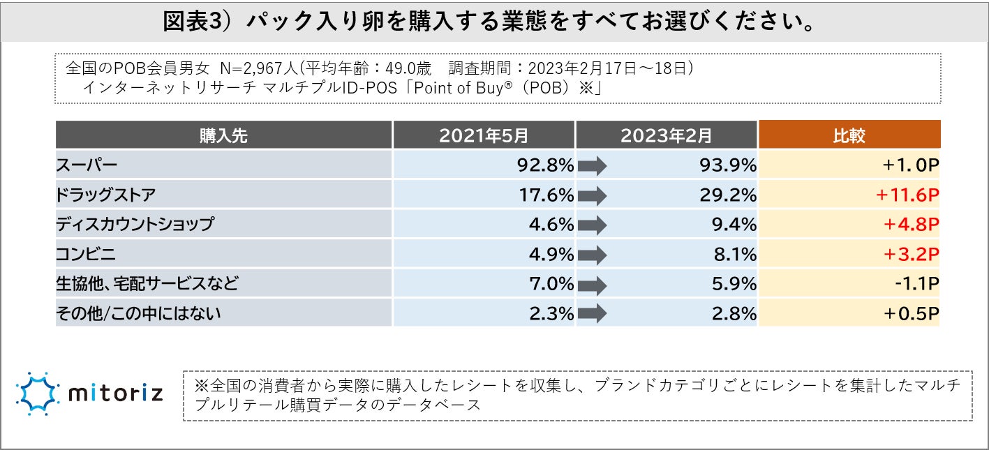 さらにレシートデータ(POBデータ)から分析し、たまごの単価推移を「コンビニ」「スーパー」「ドラッグストア」の3業態で比較したところ、全体的には値上がりをしているものの、平均単価が最も安いのはドラッグストアという結果となりました(図表4)。「価格」を重視する人が増加傾向にある中で、たまごを安価で購入できる点が、ドラッグストアが購入先として伸長した一因と考えられます。