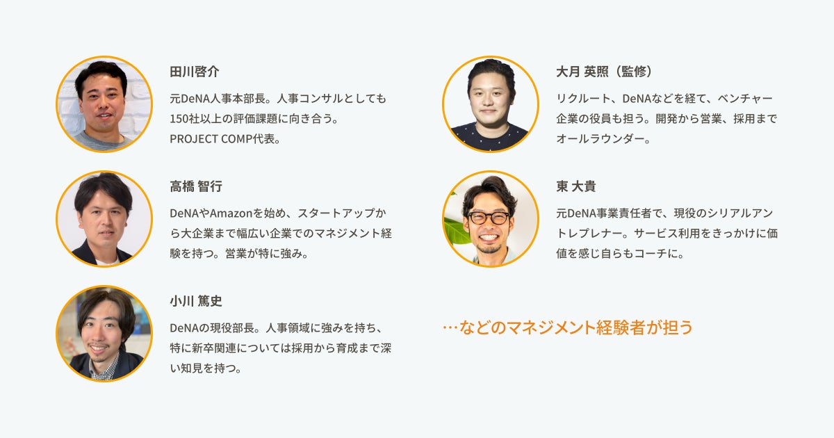 本サービスで提供するプロフェッショナルコーチングは、DeNAやリクルートなどのメガベンチャー出身で事業部門や人事部門において豊富なマネジメント経験を持つメンバーが担当します。事業会社の現場で苦労した経験を元に、質の高いコーチングを提供して参ります。