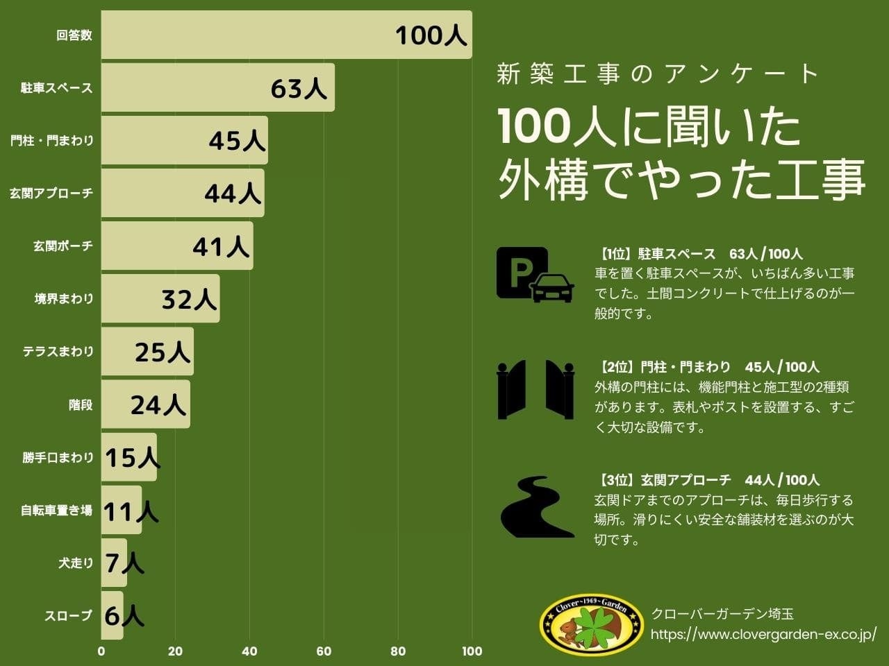 まず、最も多く施工されたのは駐車スペース(63%)。次いで門柱・門まわり(45%)、玄関アプローチ(44%)となりました。
