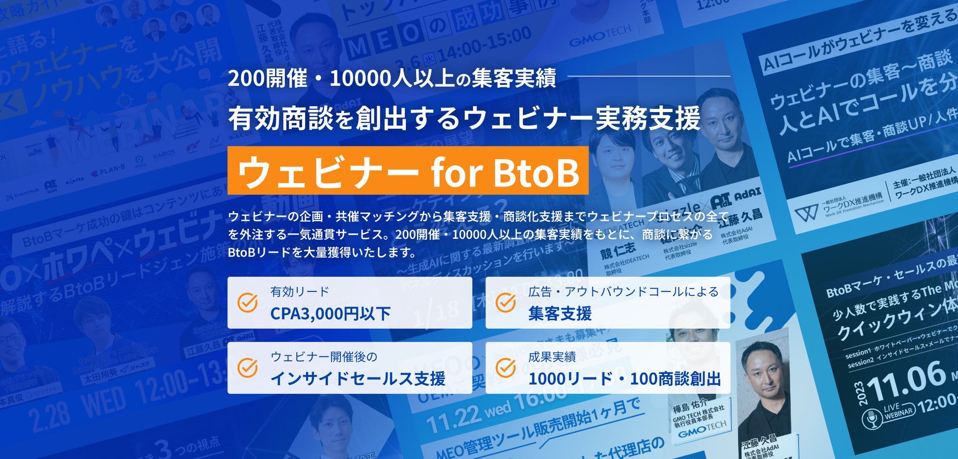 株式会社AdAI(アドエーアイ)は、ウェビナーによるリードの創出を得意としておりウェビナーの運用代行『WPO』プランを展開中。事業開始1年目にしてウェビナー運用代行は200本以上・10000人の集客実績を持つ。2025年9月には、ウェビナーからアーカイブ配信まで継続的なリード獲得ができるメディア『Webinar Stock』をローンチ(一部AI機能も搭載。詳細は別途公表)ウェビナーの伴走支援が可能なため、初めてウェビナーを行う企業様〜ウェビナーを頻度高く実施されている大手企業様含めて幅広くご利用いただいております。