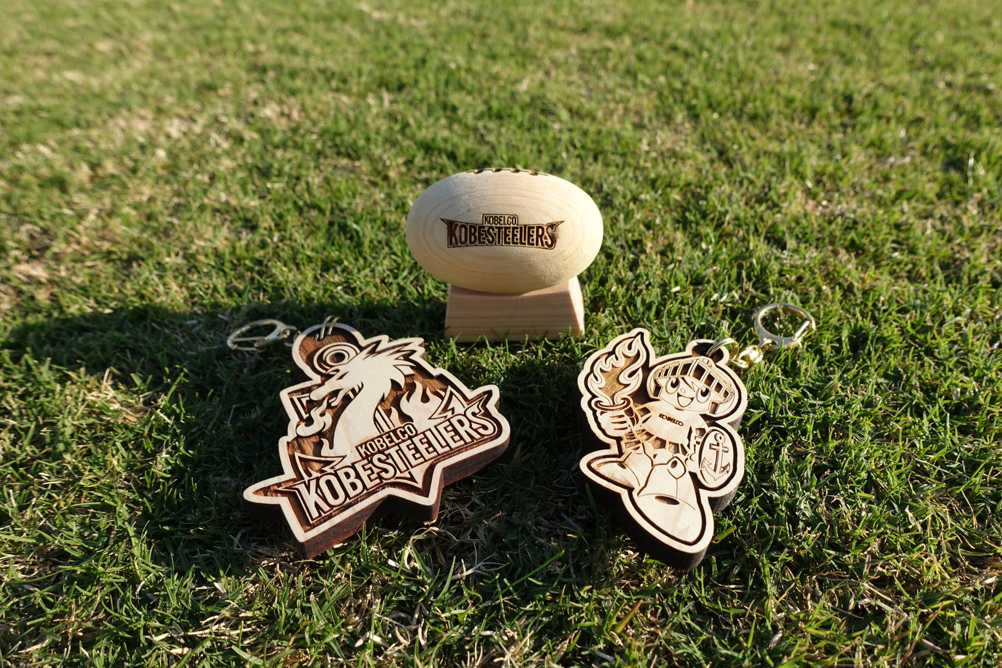 この度、六甲山の健全な育成のために伐採された間伐材を使用したサステナブルなオフィシャルグッズ、チームエンブレムとコーロクンのキーホルダー、ミニチュアラグビーボール(台座付き)を発売いたします。