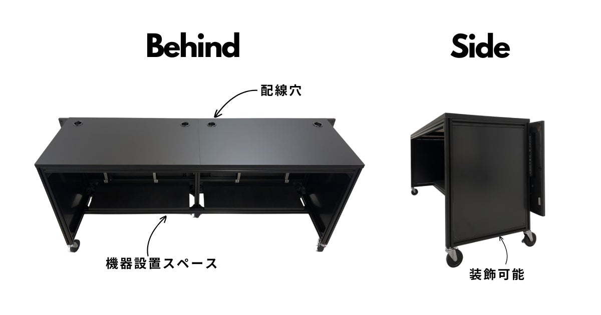 ・デスク側面には、ステッカーロゴ等を張り付けられるスペースがあり、ユーザー様で独自カスタマイズができます。また、取り外すこともできます。